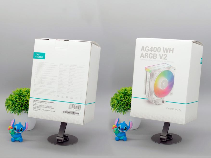 Deepcool AG400 WH ARGB V2 находится в белой коробке с цветным изображением товара и названием модели крупным шрифтом на первом плане. На задней части коробки находится таблица с подробным характеристиками блеклым серым шрифтом, который стремится раствориться на окружающем белом фоне. Странное решение, но коробку пора открывать и оценить содержимое.