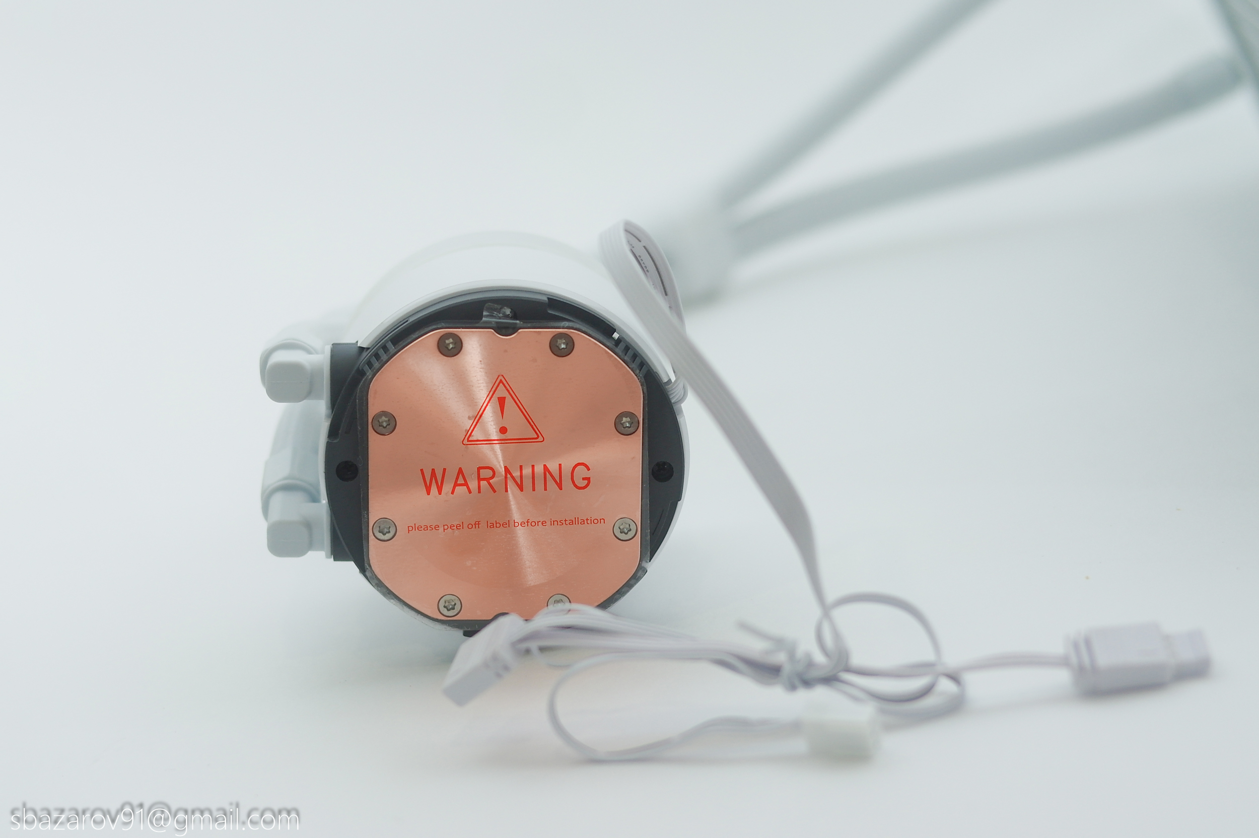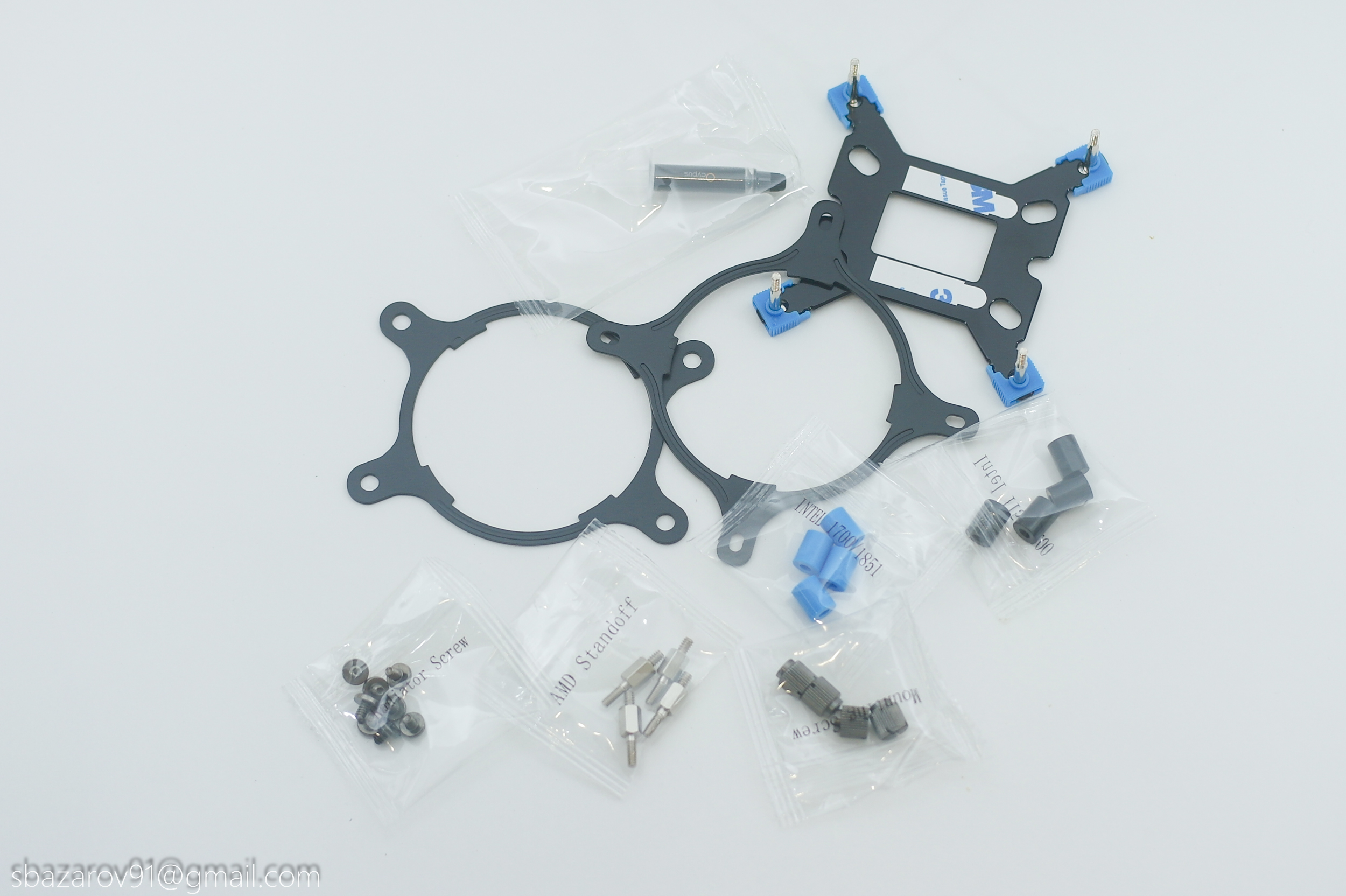 В качестве материалов используется пластиковый корпус с габаритами Φ74,5*60 мм. Фитинги под шланги выходят с нижней части, что позволяет ориентировать его как в сторону оперативной памяти, так и к задней части корпуса. С противоположной стороны выходят разъемы для подключения к материнской плате (длины достаточно для прокладки за задней панелью корпуса).