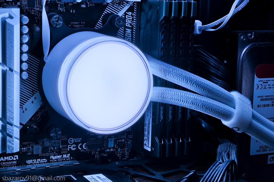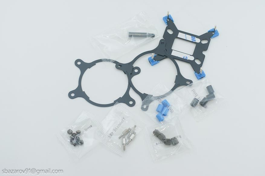 Между водоблоком и радиатором охлаждающая жидкость курсирует по двум трубкам, длина которых составляет 40 см. Это позволяет устанавливать радиатор в любой части корпуса, будь то верхнее, нижнее, заднее или переднее расположение. Для более эстетичного расположения трубок имеется пара велкро-липучек.