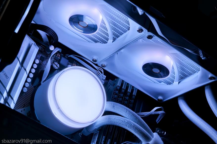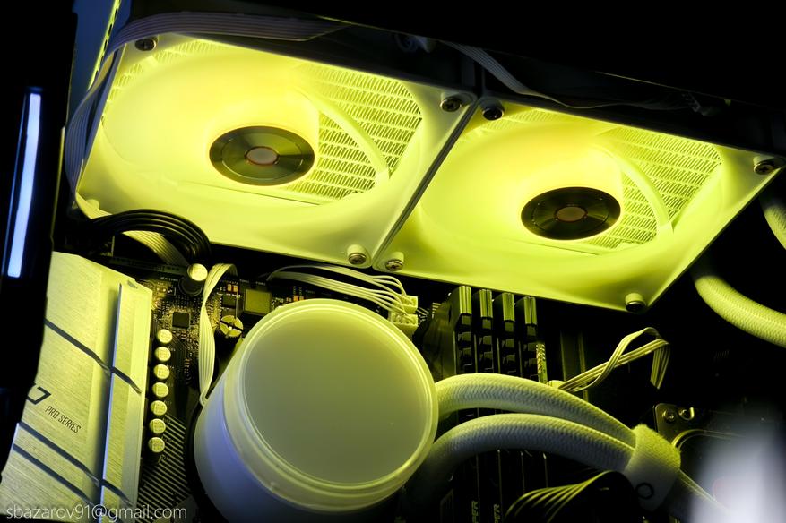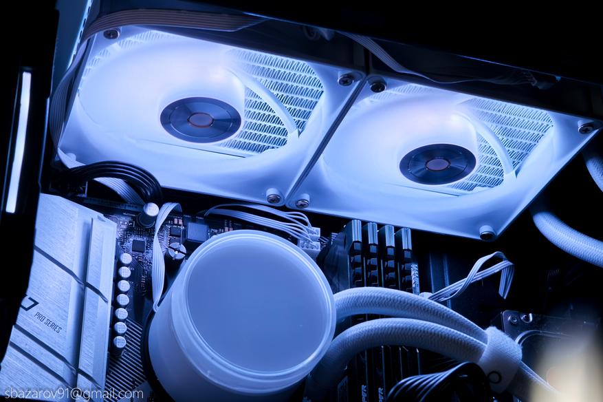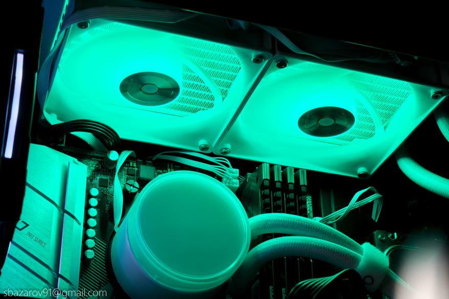 Обе вентилятора работает в диапазоне оборотов от 500 до 2000+-10% об/мин и создают уровень шума не более ≤29 дБА. Для подключения используется 2 коннектора: 4-pin с PWM для регулировки оборотов и 3-pin для подсветки. Как и в случае в водоблоком, вентиляторы могут подключаться к ARGB разъему (5V) материнской платы для управления подсветкой.