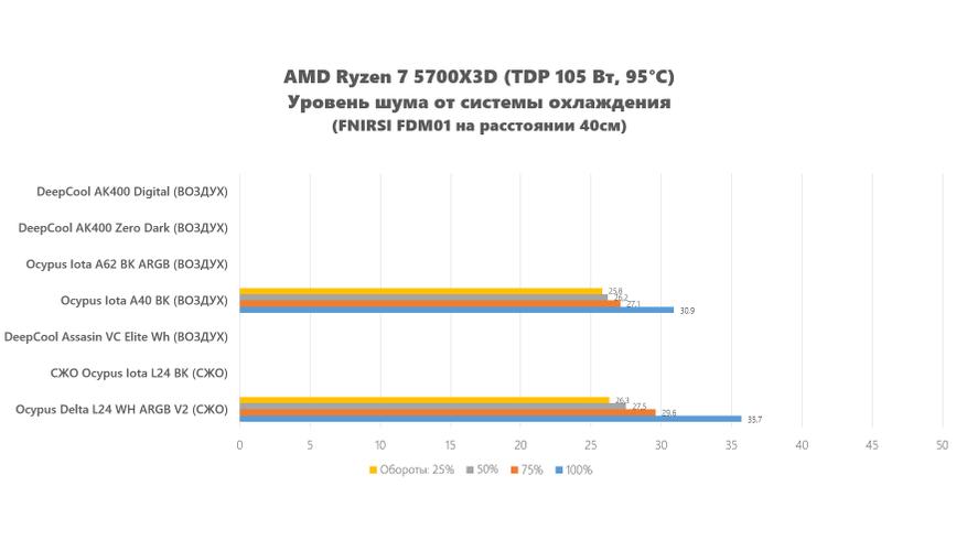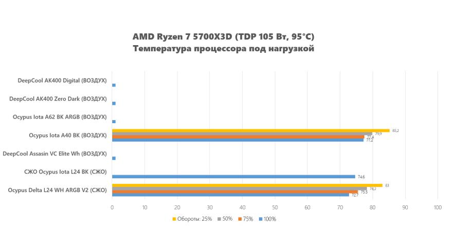 СЖО Ocypus Delta L24 WH ARGB V2 эффективно справляется с охлаждением Ryzen 7 5700X3D даже при средних оборотах (50%). Для большинства сценариев оптимальным является автоматический режим, который не поднимает обороты выше 75% оборотов (1575 RPM), что обеспечивает низкие температуры с практически полным отсутствием шума. Ну, а если вы умеете настраивать профиль оборотов через BIOS или ПО материнской платы, то это позволит подобрать еще лучший баланс производительности в зависимости от нагрузки.