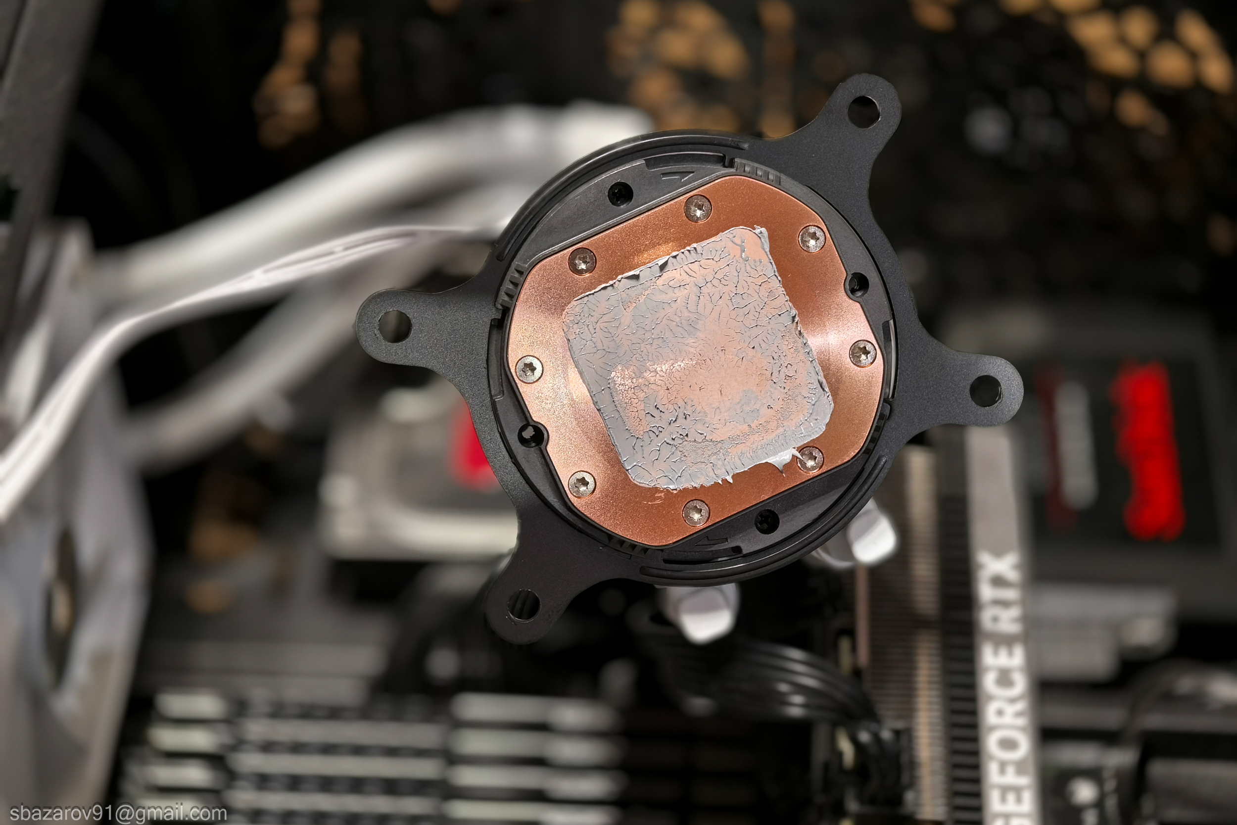 Кстати, в отличие от СЖО Ocypus Iota L24 BK, о которой я рассказывал в прошлом обзоре, в обновленной СЖО Delta L24 WH ARGB V2 применяется быстросъемное крепление. Как это выглядит? На подошву водянки устанавливаем ответную часть путем прокручивания по часовой стрелке. Далее наносим на CPU термопасту и устанавливаем водоблок на винтовые стойки от штатного бэкплейта. И только тут потребуется отвертка для более надежной и плотной подгонки двух плоскостей. В той же СЖО Ocypus Iota L24 BK шел отдельный комплект для установки, требующий больших усилий.
