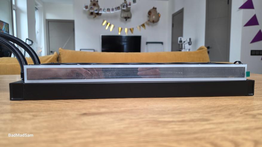 Радиатор классический для формата 360 мм. Это вытянутый прямоугольный блок с ровной черной окраской, без сложных декоративных накладок на боковинах. По габаритам он крупный, с длинным корпусом и стандартной толщиной около 27 мм. Основная часть не броская, но полностью нейтральной ее не назовешь, потому что сверху у вентиляторного блока и по торцам проходит световая полоса. То есть в выключенном состоянии верхняя часть выглядит как единая черная панель, а при включении она уже воспринимается как полноценная с RGB-подсветкой, которая проходит почти по всей длине вентиляторного блока. Подсветка работает не только в зоне крыльчаток, но и по внешнему контуру самого модуля.