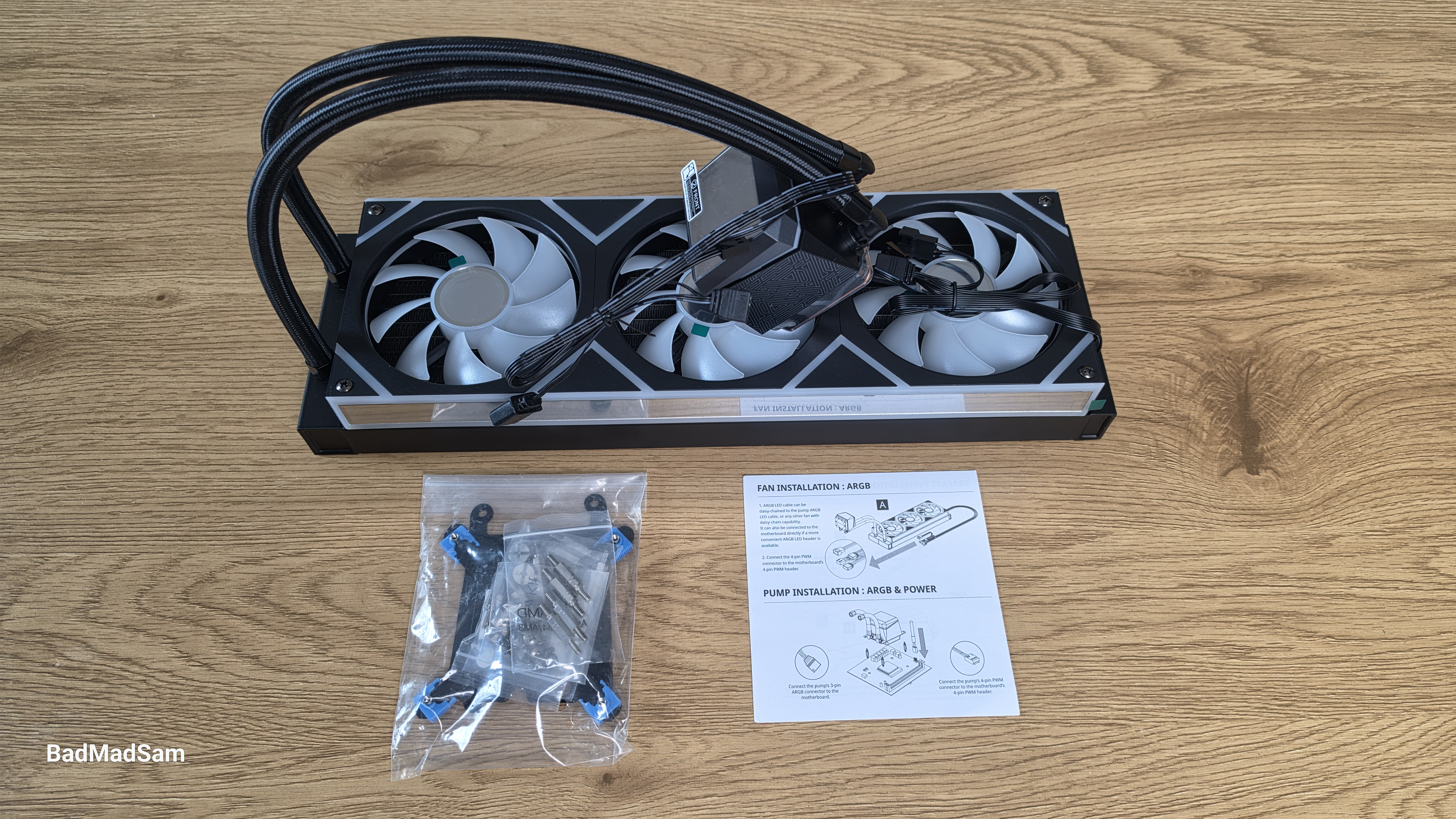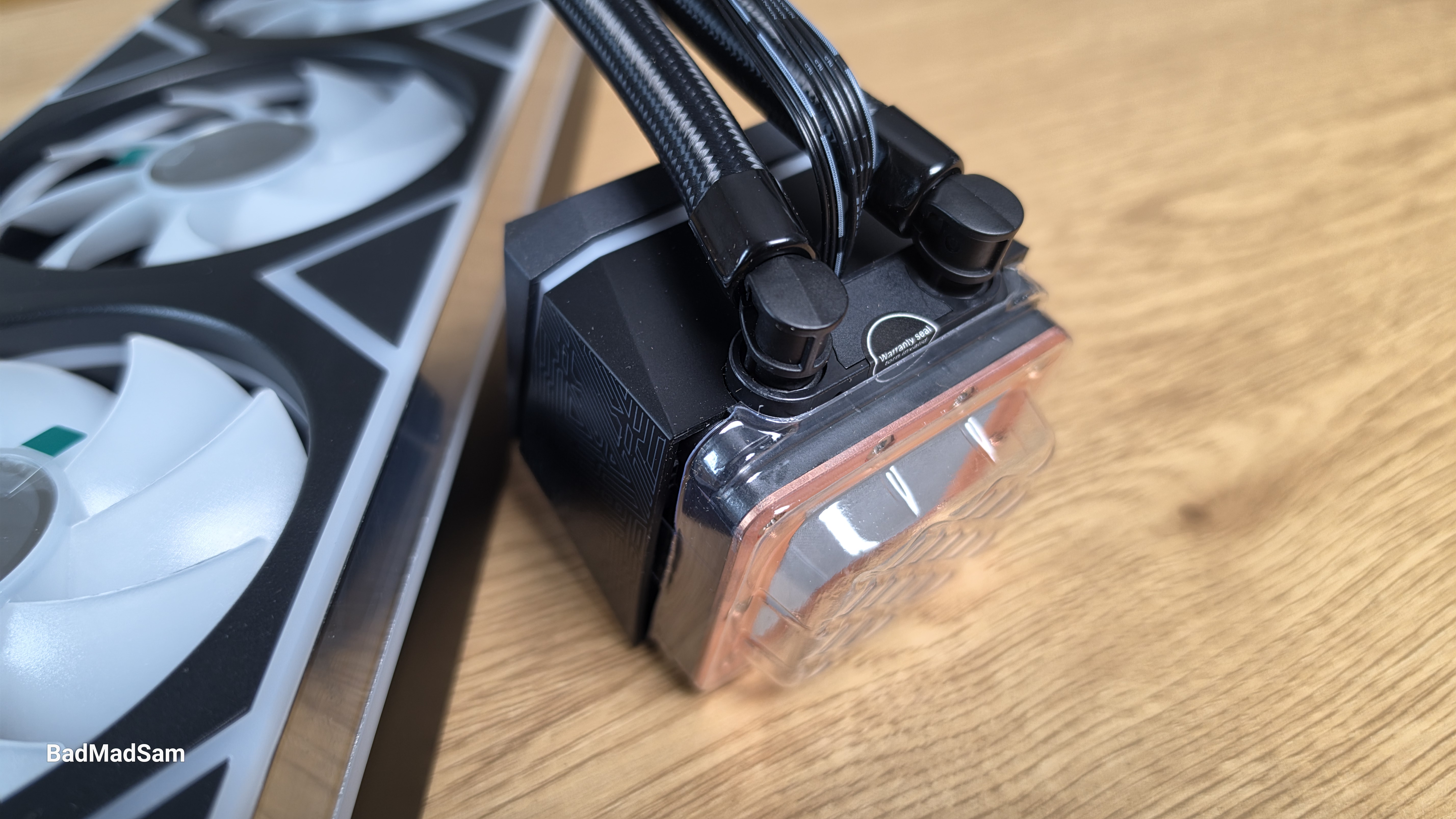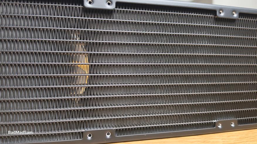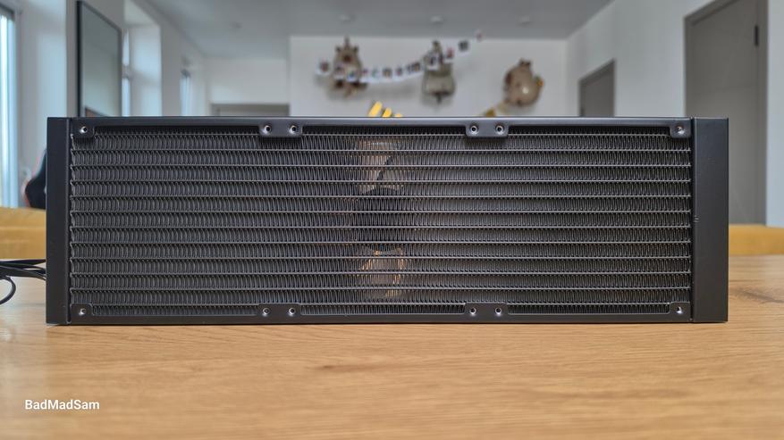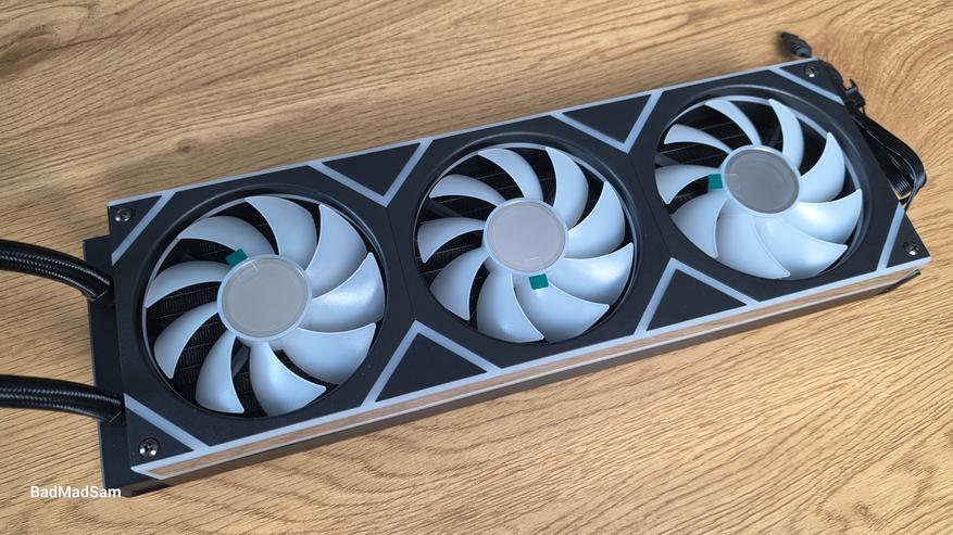 Сам радиатор довольно строгий и утилитарный, а весь декоративный акцент вынесен на единый вентиляторный модуль и водоблок.