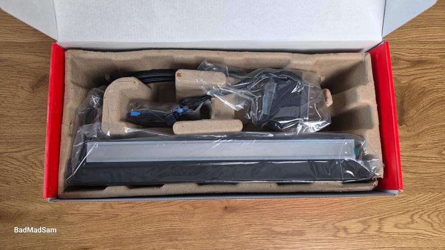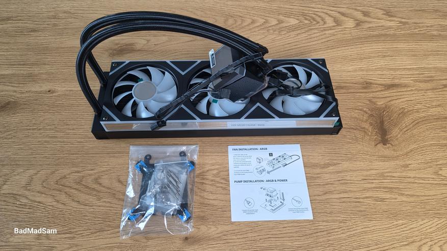 Внутри все уложено в картонный лоток, и прикрыто защитной вставкой. В комплект входит сама система охлаждения с уже установленным блоком вентиляторов, набор креплений под платформы Intel и AMD, стойки, прижимные рамки, винты для фиксации радиатора и вентиляторов, а также инструкция.