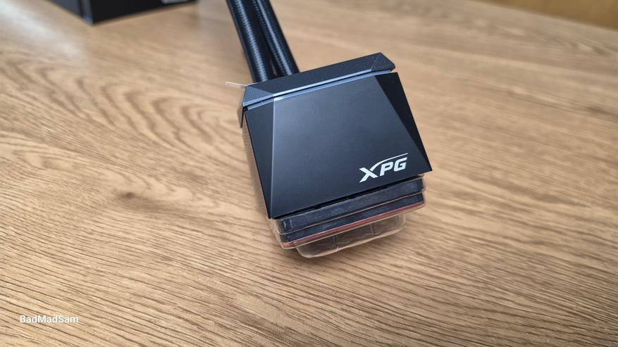 Сам водоблок хорошо совпадает по стилю с вентиляторным модулем. Корпус компактный, со скошенными гранями и выраженной угловатой формой. Верхняя часть выполнена в виде глянцевой зеркальной панели с эффектом бесконечного зеркала. Внутри этой зоны расположен логотип XPG, а сама подсветка построена так, что световые линии как будто уходят в глубину корпуса. По бокам добавлен геометрический рисунок, который делает поверхность не такой пустой. В нижней части корпуса проходит отдельная световая полоса, и за счет нее водоблок не выглядит просто черным кубом с экраном сверху.