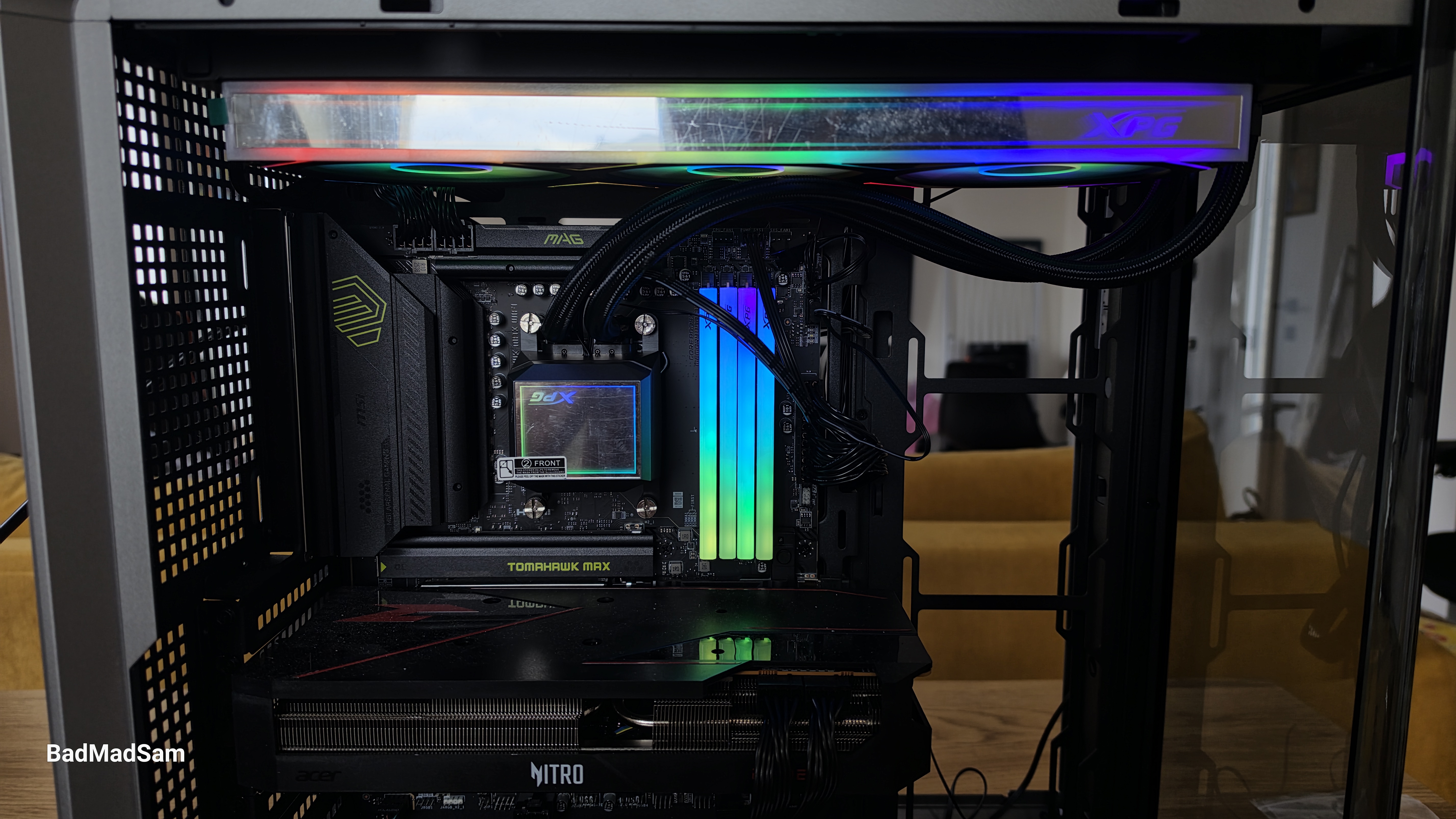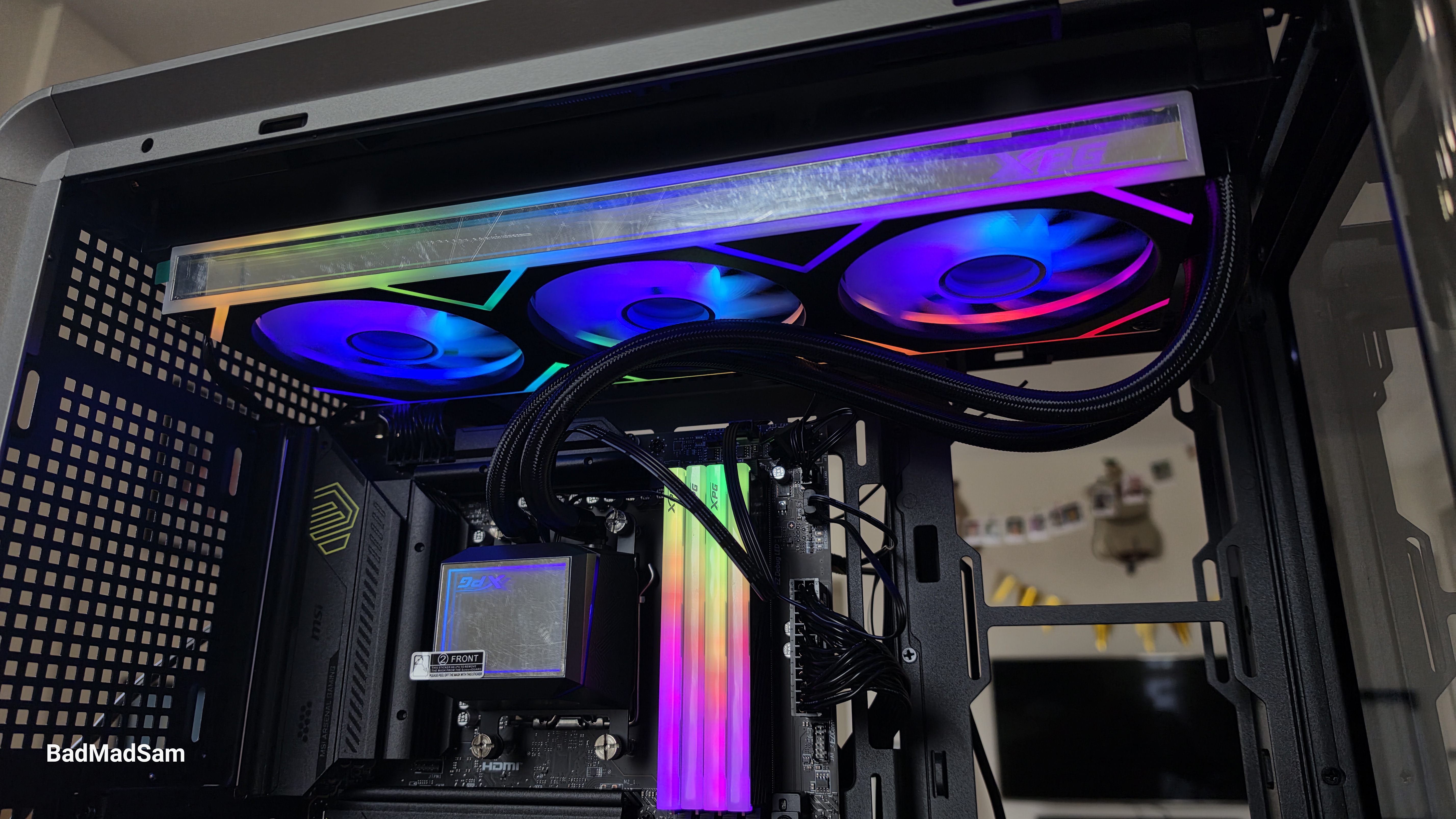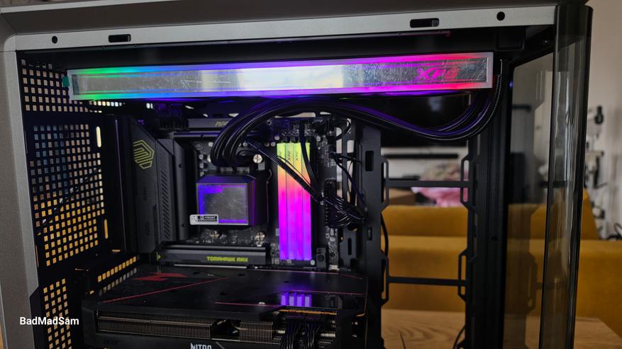 Говоря о вентиляторном модуле, хочу обратить внимание, что XPG ушла от обычной схемы с тремя раздельными вентиляторами и сделала одну общую рамку. Снаружи это воспринимается именно как цельная панель, разделенная на три зоны. Между вентиляторами нет привычных промежутков, а вся фронтальная часть оформлена геометрическими линиями и треугольными вставками. За счет этого блок выглядит не как набор из трех одинаковых вертушек, а как единый декоративный элемент. Подсветка идет не только по кольцам вокруг вентиляторов, но и по верхней грани, по нижним участкам и по торцам. На одном из участков сверху встроен и логотип XPG, который тоже подсвечивается.