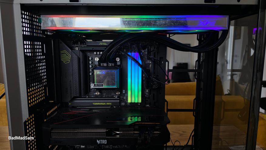 В установленном виде Levante II 360 выглядит цельно. Вся система строится вокруг длинного светящегося блока наверху и компактного водоблока у процессора. При этом водоблок не громоздкий, он не перекрывает пространство вокруг сокета и не создает ощущение тесноты. Его габариты подразумевают, что ни с памятью, ни с видеокартой проблем по совместимости не должно возникнуть.