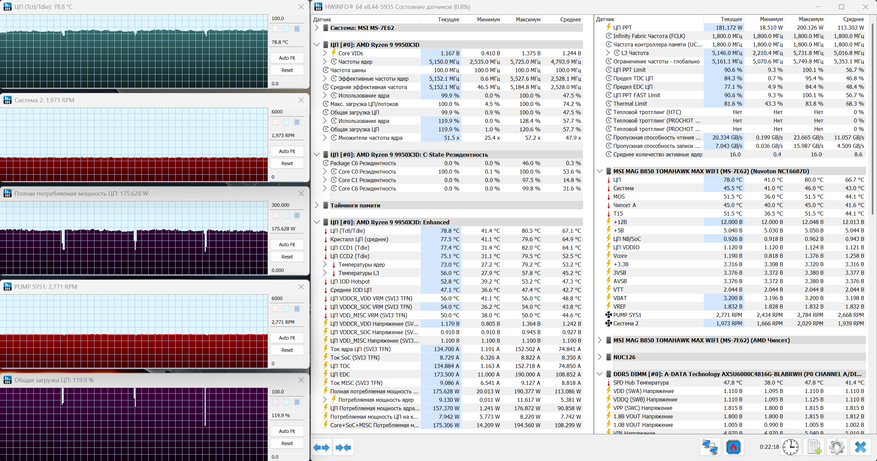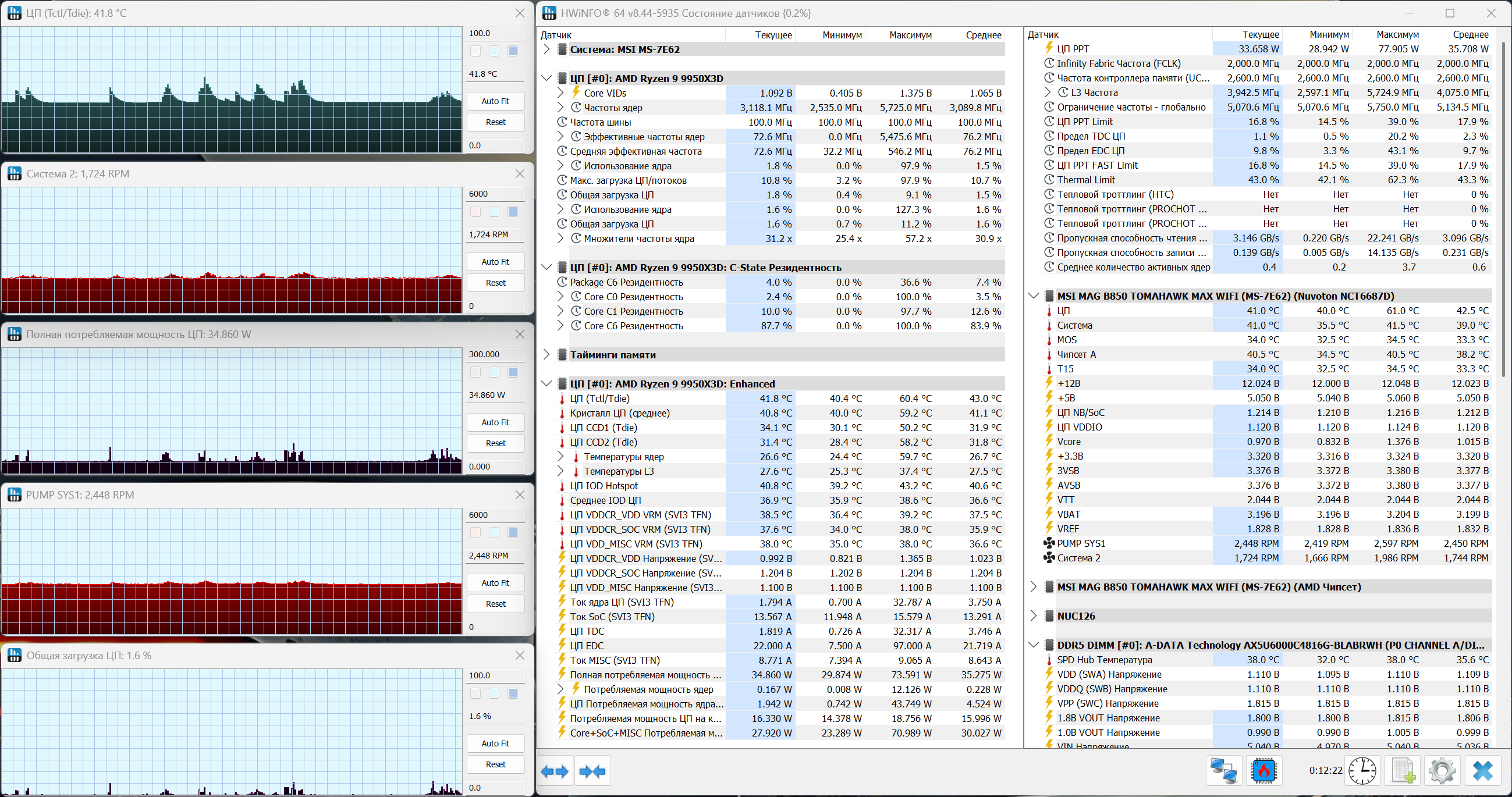 В режиме простоя система ведет себя без резких скачков. Температура процессора держится на уровне около 41-42°C, при этом видны небольшие кратковременные подъемы, которые быстро сглаживаются. Это типичная картина для платформы Ryzen, где фоновые процессы периодически дают короткие пики нагрузки. Загрузка процессора минимальная, в районе 1-2%, эффективные частоты ядер практически сброшены. Энергопотребление при этом остается на уровне 30-35 Вт, что соответствует поведению системы в состоянии покоя. Требует внимания режим работы системы охлаждения. Вентиляторы вращаются примерно на уровне 1700 об/мин, помпа — около 2400-2500 об/мин. Для простоя это довольно высокие значения, за счет чего температура удерживается стабильно, троттлинг отсутствует.