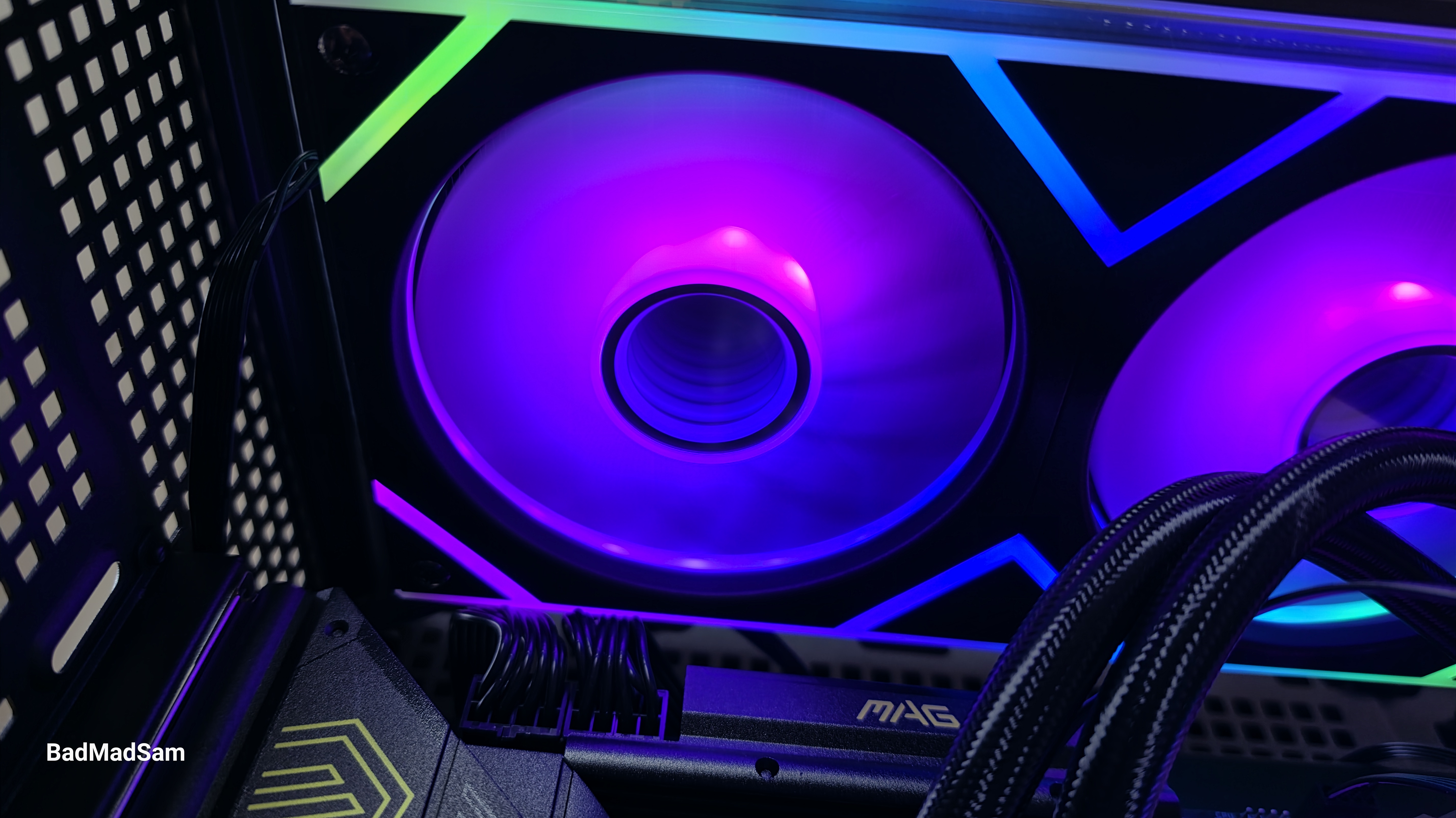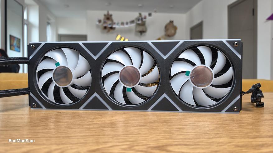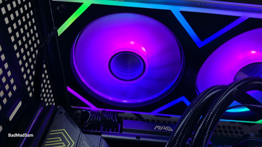 Подсветка у этой модели вообще сделана как один из главных визуальных аргументов. Она яркая, контрастная и многозонная. В рабочем состоянии вентиляторный блок светится сразу в нескольких местах: световые кольца вокруг каждой крыльчатки, внутренние зоны самих вентиляторов, длинная верхняя линия, геометрические вставки между секциями и боковые участки по краям. Из-за этого в темном корпусе система будет смотреться как сплошная композиция. Цвета переходят плавно, без скачков. Однако, мне показалось, что у вентиляторного блока внешние углы подсвечены не совсем равномерно, у водоблока с этим дела обстоят лучше.