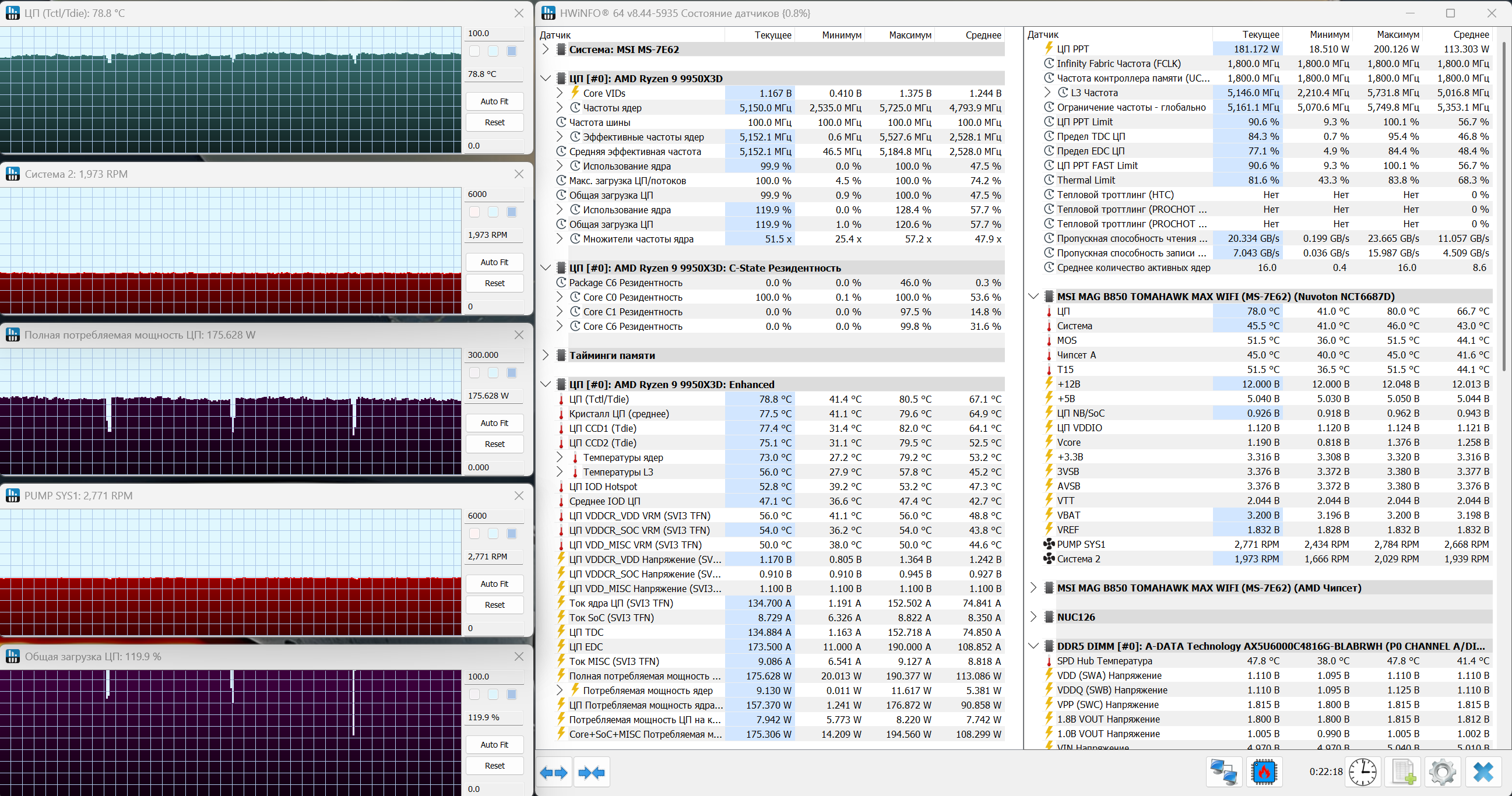 В рендеринге нагрузка уже выходит на максимум, и это хорошо видно по всем параметрам. Процессор загружен практически полностью, график загрузки держится на уровне 100%, без провалов. Частоты при этом остаются высокими, система не уходит в агрессивное снижение. Температура процессора фиксируется в районе 78-79°C, с пиками до 80°C. График ровный, без резких скачков, что говорит о стабильной работе охлаждения под длительной нагрузкой. При этом важно, что температура не продолжает расти со временем, а удерживается на одном уровне. Энергопотребление заметно увеличивается и держится в районе 170-175 Вт, что уже соответствует тяжелой многопоточной нагрузке для этой платформы. Система охлаждения работает почти на максимуме. Вентиляторы вращаются на уровне 1970 об/мин, помпа — около 2700-2800 об/мин. Это предельный режим, при котором кулер отдает максимум своей эффективности. При таких условиях запас по температуре еще остается. Троттлинг не фиксируется, Тестирование в стресс-тесте проходит в рабочем диапазоне и не упирается в критические значения.