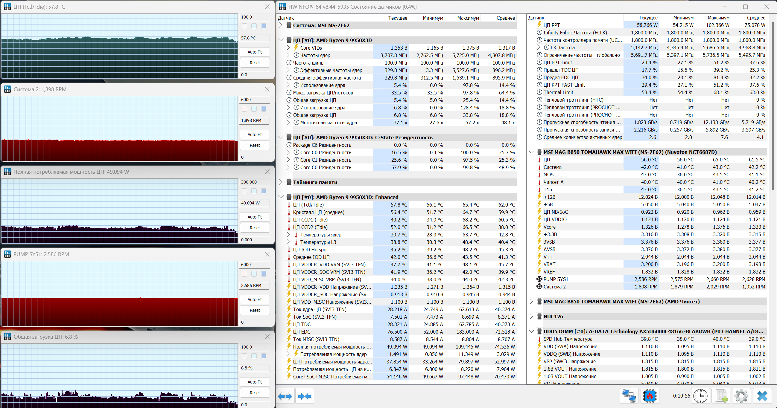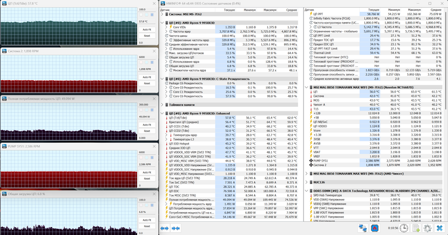 В игровом сценарии нагрузка становится уже заметно выше, но система по-прежнему ведет себя стабильно. Температура процессора держится в районе 57-58°C, без скачков, график выглядит ровным, с незначительными колебаниями. Загрузка процессора находится на уровне 5-7%, при этом частоты уже заметно выше, чем в простое, что, в принципе, соответствует характеру игровой нагрузки. Энергопотребление поднимается примерно до 45-50 Вт, что также укладывается в типичный сценарий для подобного режима. Система охлаждения при этом выходит на более высокие обороты. Вентиляторы работают примерно на уровне 1900 об/мин, помпа — около 2500-2600 об/мин. Это уже практически верхний диапазон для вентиляторов, за счет чего температура удерживается в стабильных рамках. Важно, что при такой нагрузке запас по охлаждению сохраняется. Температура далека от предельных значений, троттлинг отсутствует, система работает ровно, без перегревов.