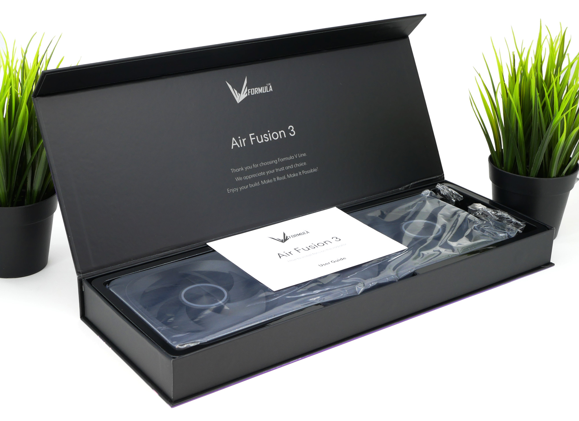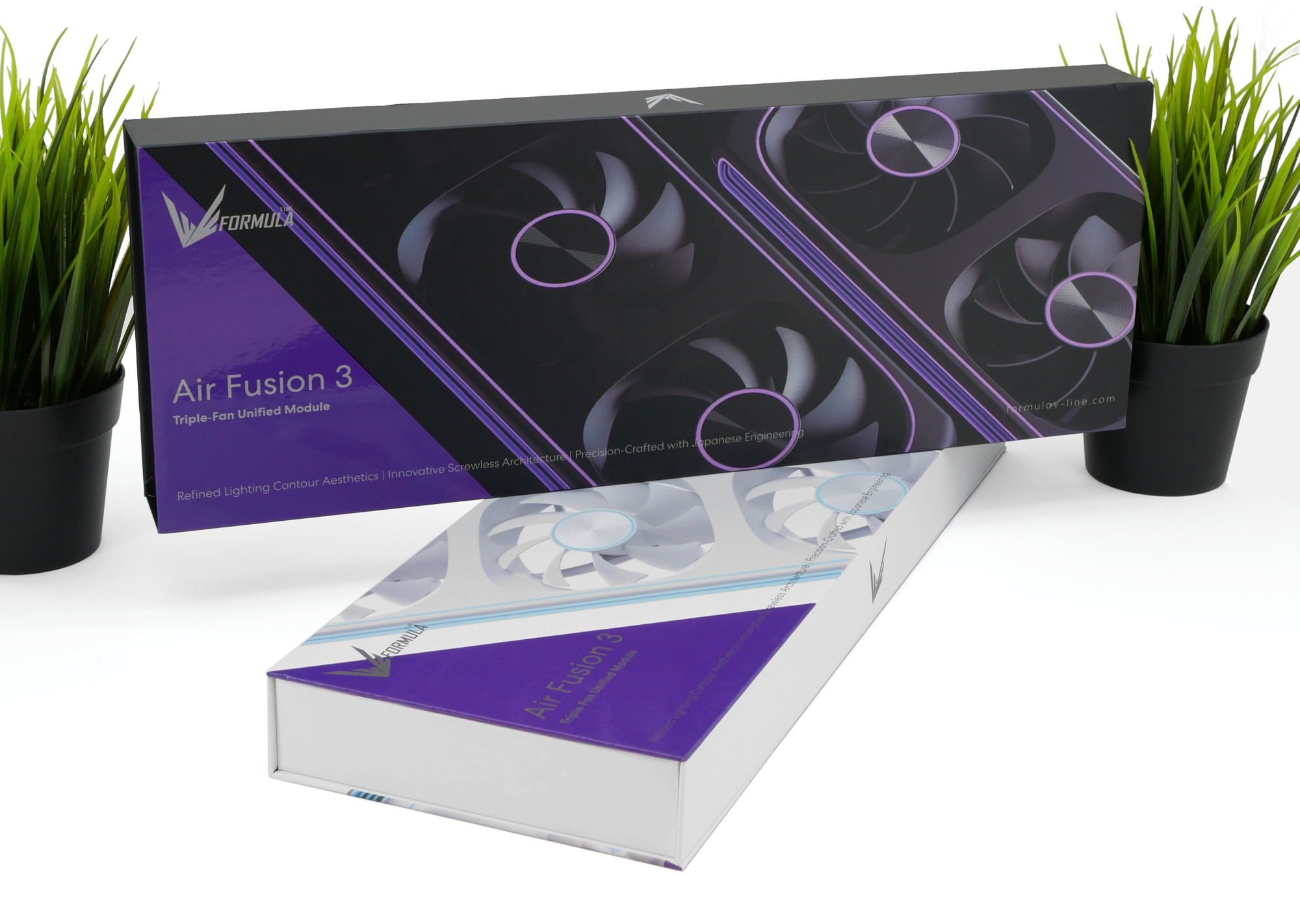 Компания Formula V Line анонсировала несколько новых продуктов на выставке Computex 2025 в мае 2025 года, решив полностью поменять вектор развития и став доступным премиальным брендом. Одной из новинок был комплект вентиляторов Air Fusion с цифрами в названии 1, 2 и 3, где число означает количество вертушек. Модель получила необычный дизайн с изысканным контуром ARGB-подсветки со скрытым креплением и покрытием имитации текстурированной кожи.
