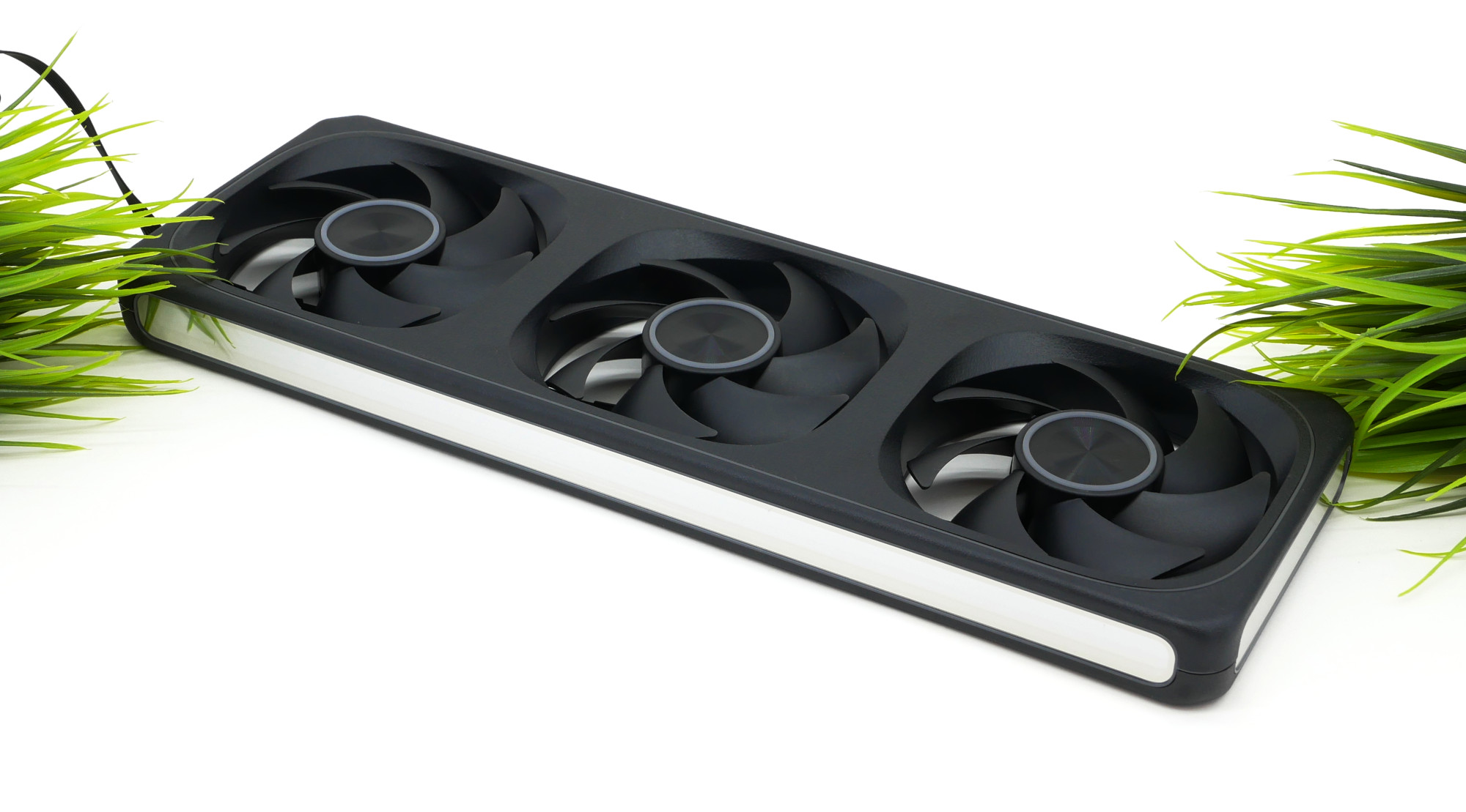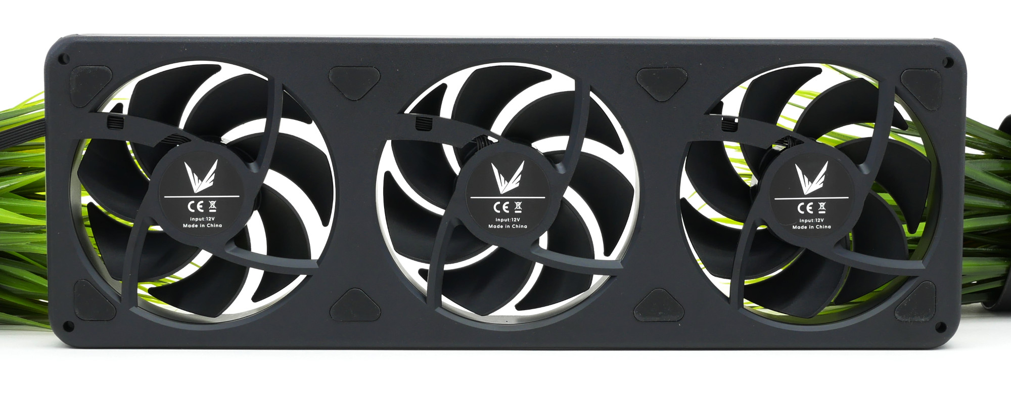 Внешне комплект смотрится необычно, его габариты 360 х 120 х 28 мм. Скорость вращения составляет 450-1800 об/мин, и заявлен гидродинамический подшипник. Значение воздушного потока достаточно среднее и составляет 39,64 CFM, но не сказано, для всего набора или каждой отдельной вертушки: я думаю, для каждого вентилятора в отдельности. Общие же показатели х3 будут приятно радовать. Против вибрации сзади находятся восемь точек с антивибрационными прокладками.