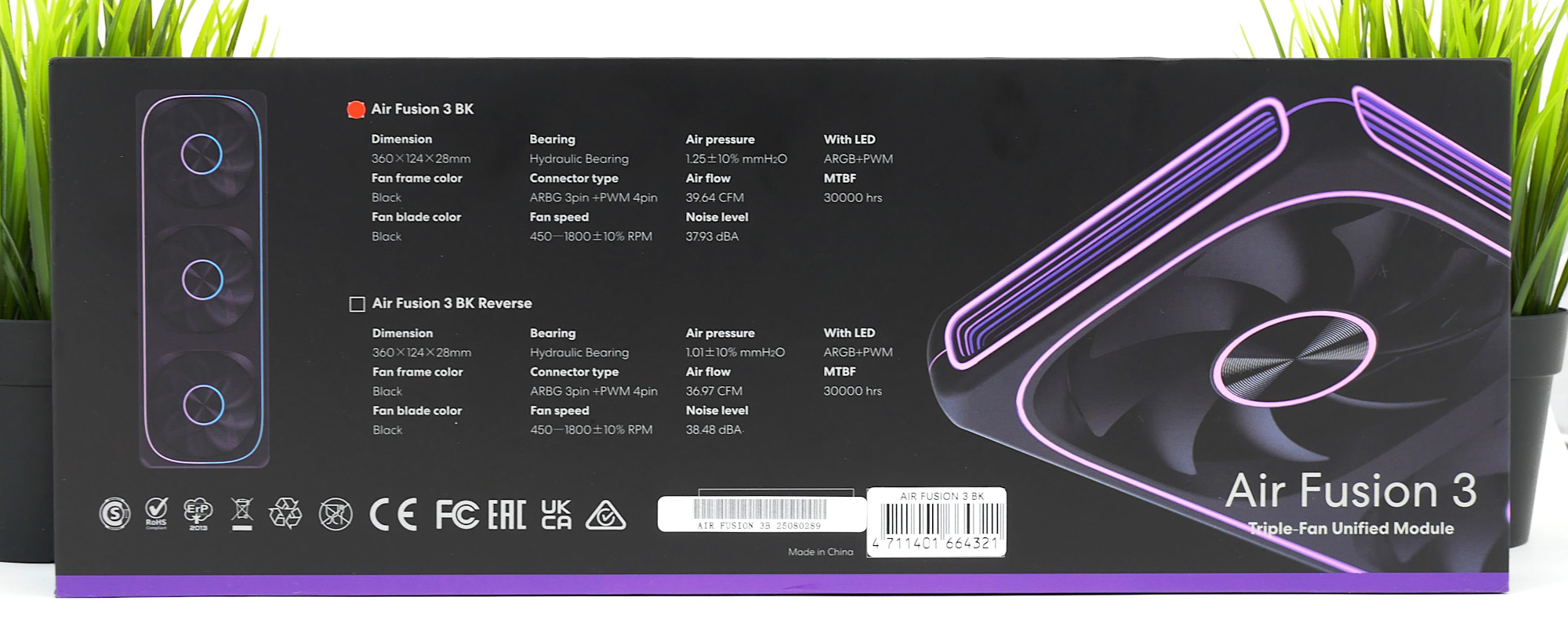 Неожиданно для себя обнаружил, что Formula V Line Air Fusion 3 поставляется в премиальной и дорогой коробке из плотного картона в виде ларца с магнитным креплением, что для недорогого продукта практически редкость и роскошь! Полиграфия на высоком уровне, как и детальное описание характеристик вентиляторов. Производитель подчеркивает необычный дизайн подсветки.