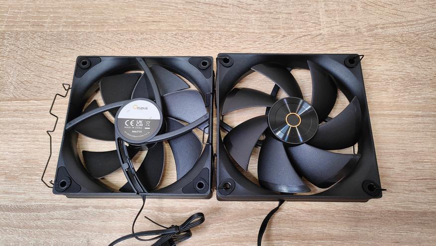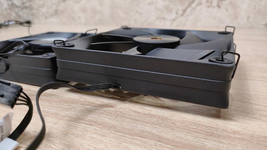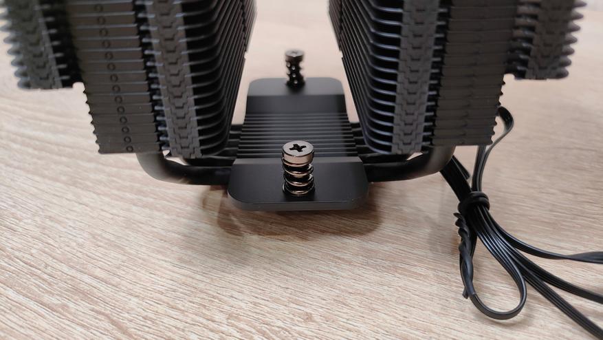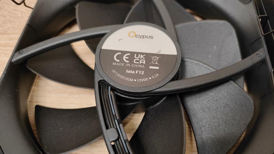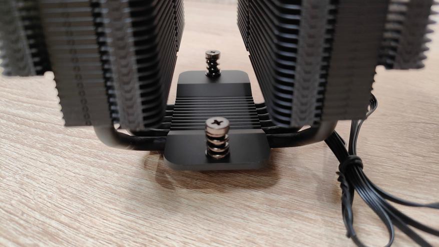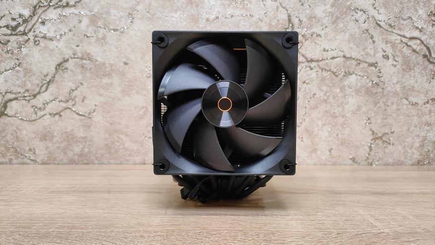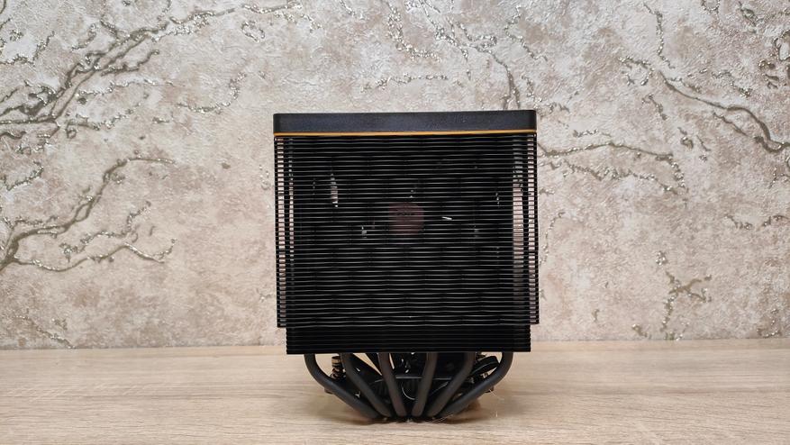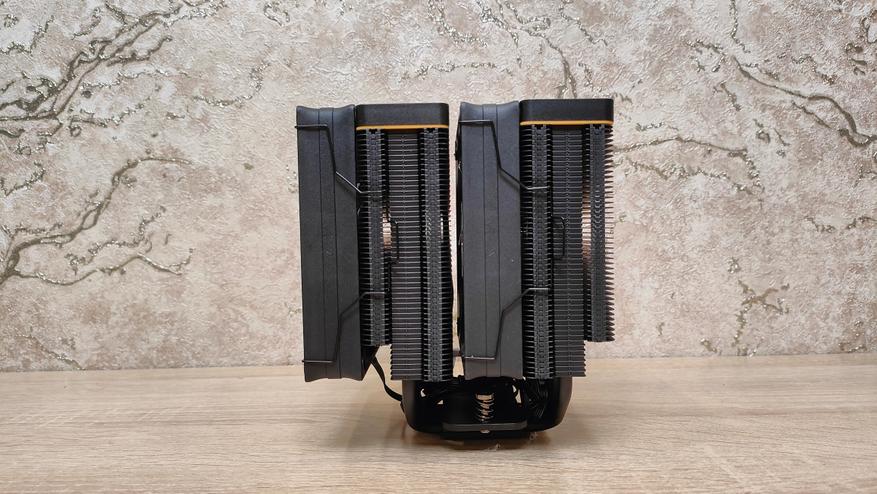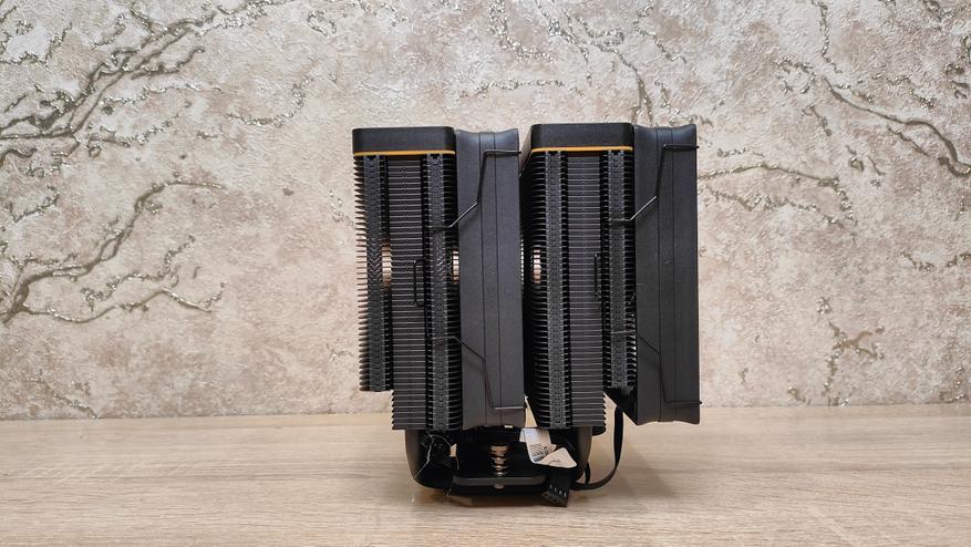 Вентиляторы уже установлены на радиаторе, но при монтаже кулера из все равно пришлось бы снимать, так что можно осмотреть их. Но чего-то принципиально нового из внешний вид не сообщает, надо смотреть на результат совместно работы с радиатором, может они сверхтихие или сверхшумные. Но это не значит, что вентиляторы это пластиковый нонейм, у них есть антивибрационные втулки, где крепятся скобы и в целом строгий внешний вид с жёлтым кольцом на роторе, как часть общего стиля всей системы охлаждения. Подсветки нет нигде, это где-то даже плюс. Маркировка очень похожа на ту, что используется у Deepcool, собственно, в целом кулер тоже чем-то напоминает их продукцию, возможно, корни ведут к одному заводу.