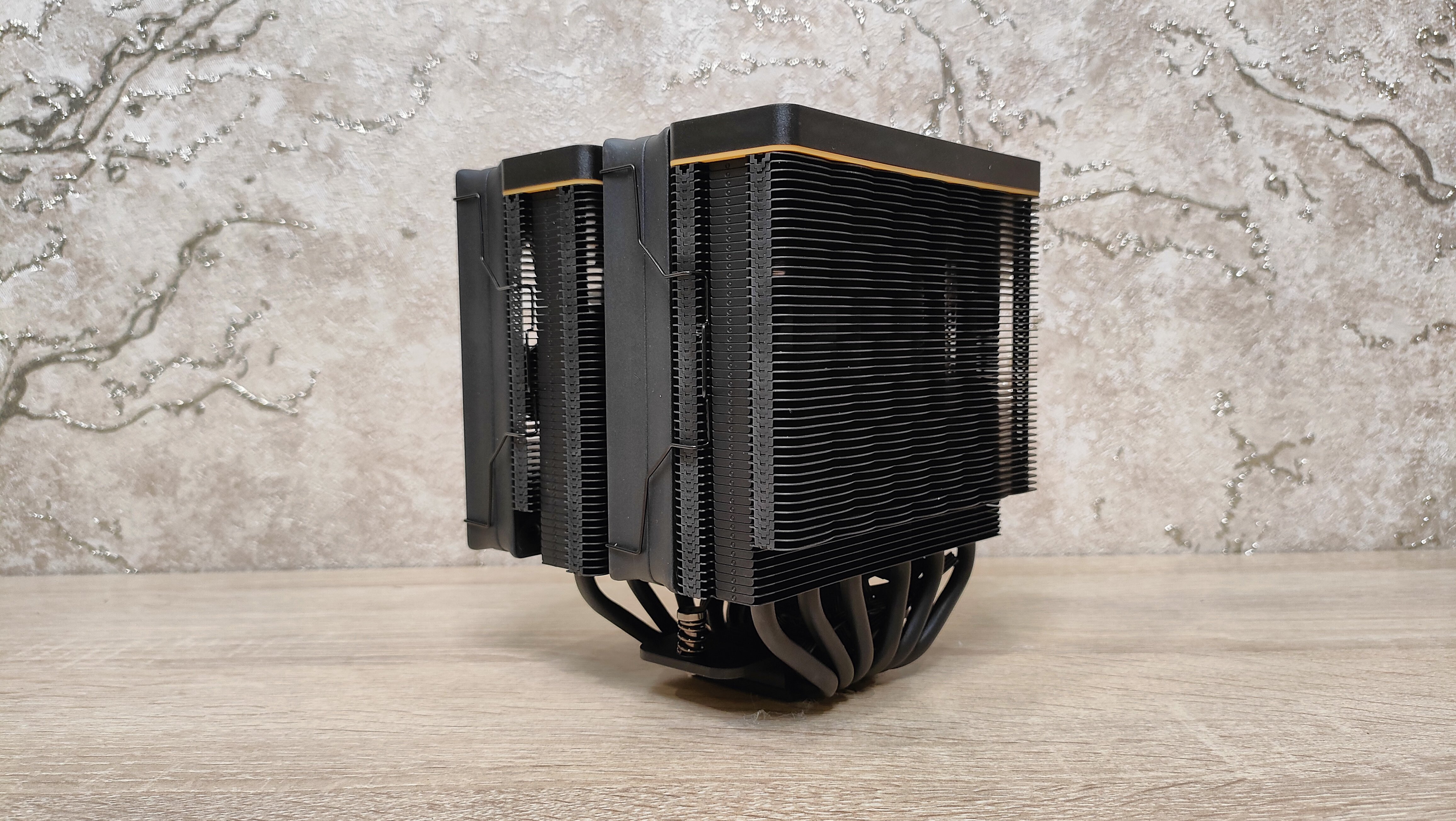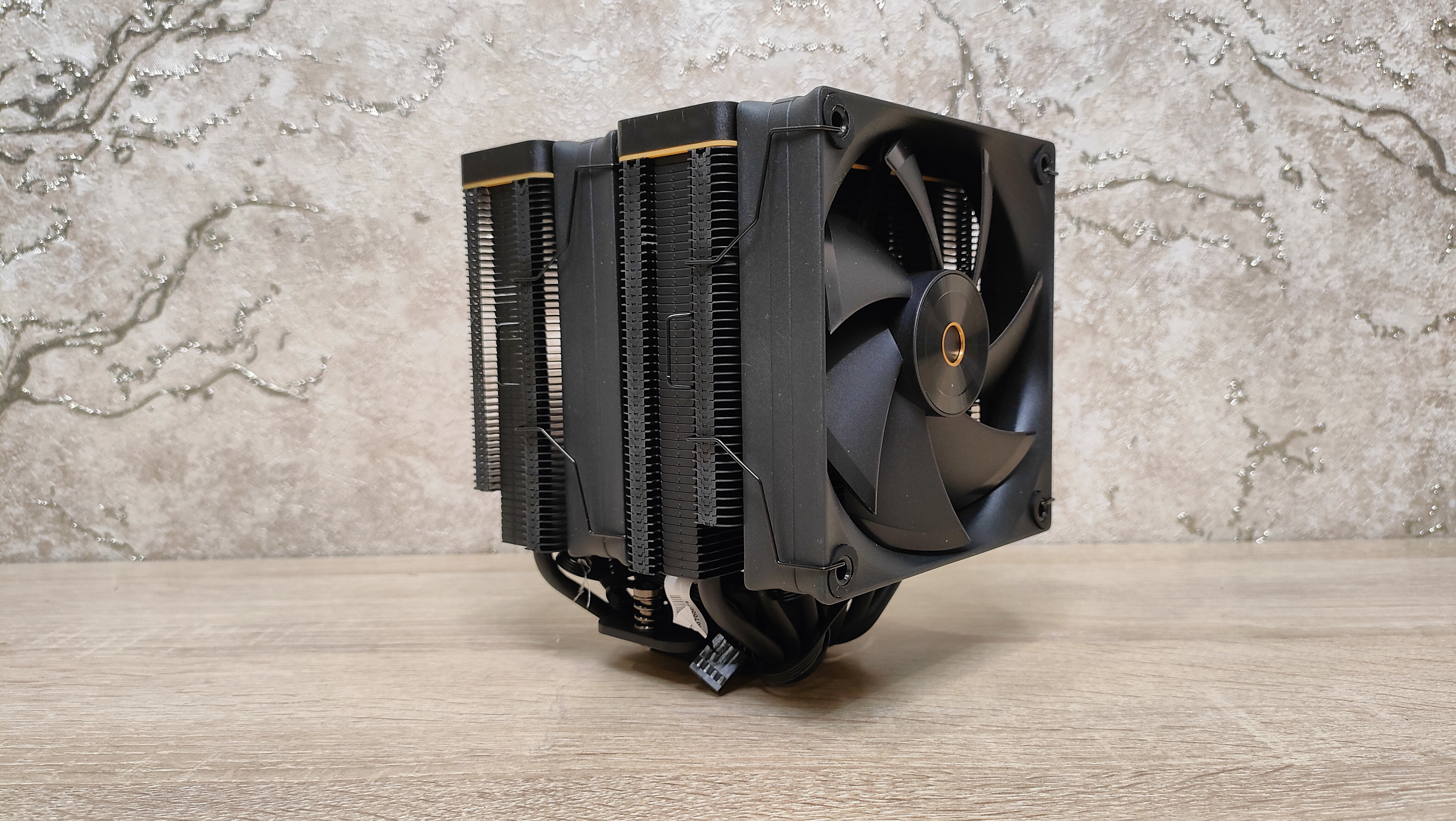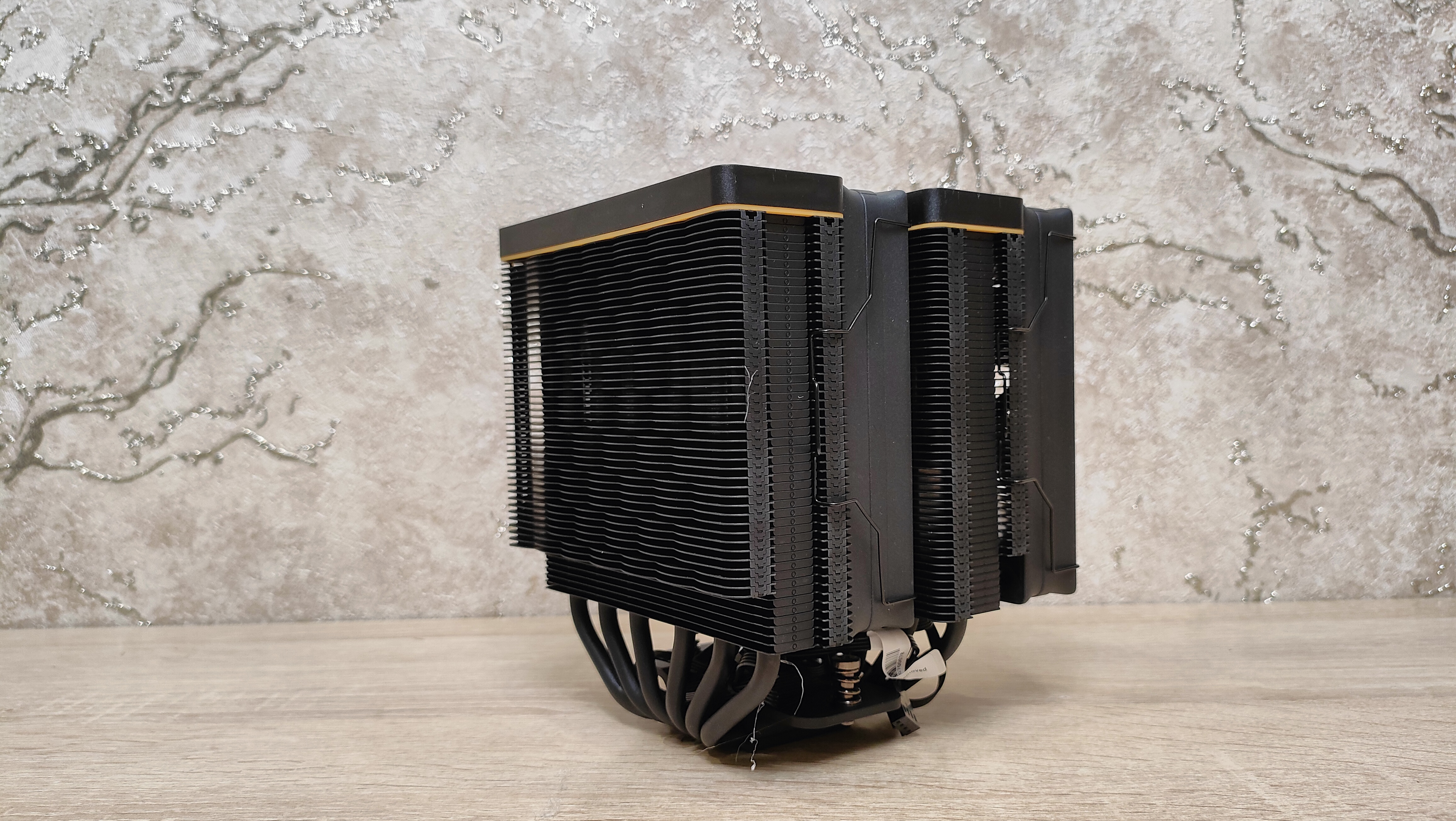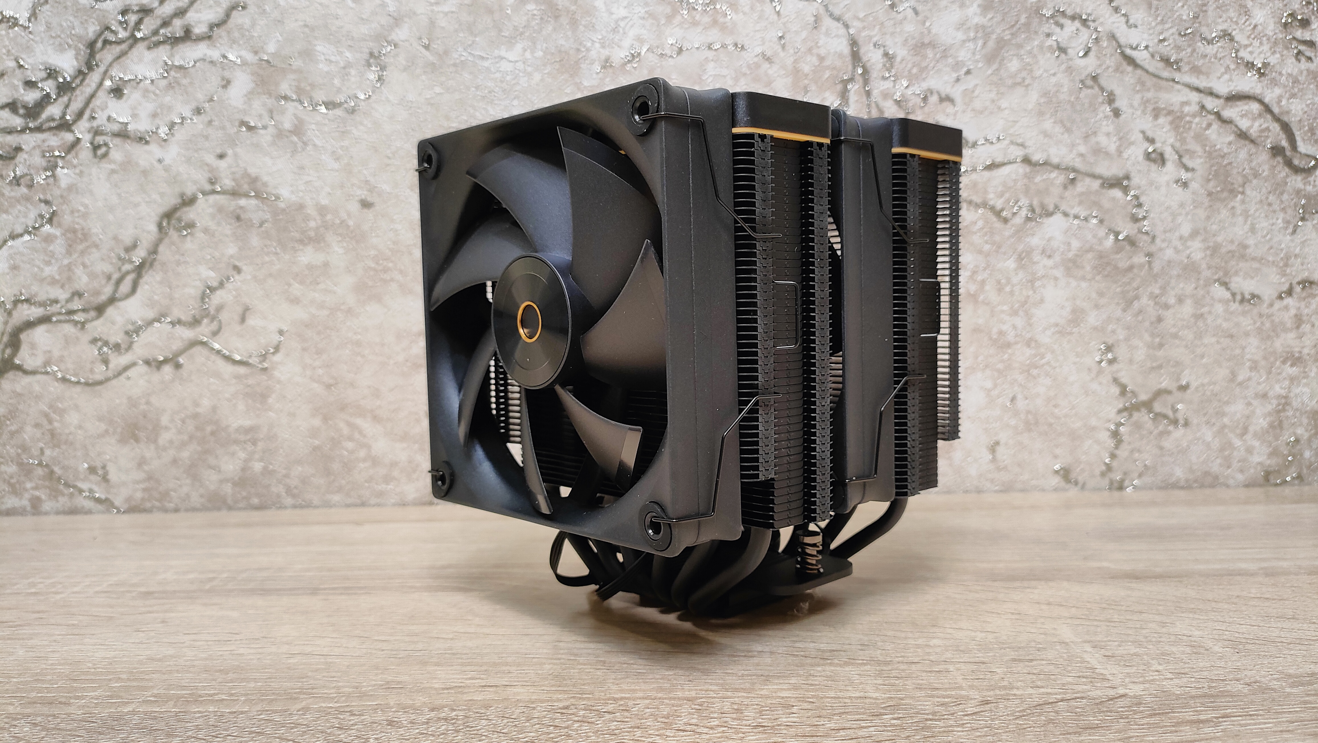 Вентиляторы уже установлены на радиаторе, но при монтаже кулера из все равно пришлось бы снимать, так что можно осмотреть их. Но чего-то принципиально нового из внешний вид не сообщает, надо смотреть на результат совместно работы с радиатором, может они сверхтихие или сверхшумные. Но это не значит, что вентиляторы это пластиковый нонейм, у них есть антивибрационные втулки, где крепятся скобы и в целом строгий внешний вид с жёлтым кольцом на роторе, как часть общего стиля всей системы охлаждения. Подсветки нет нигде, это где-то даже плюс. Маркировка очень похожа на ту, что используется у Deepcool, собственно, в целом кулер тоже чем-то напоминает их продукцию, возможно, корни ведут к одному заводу.