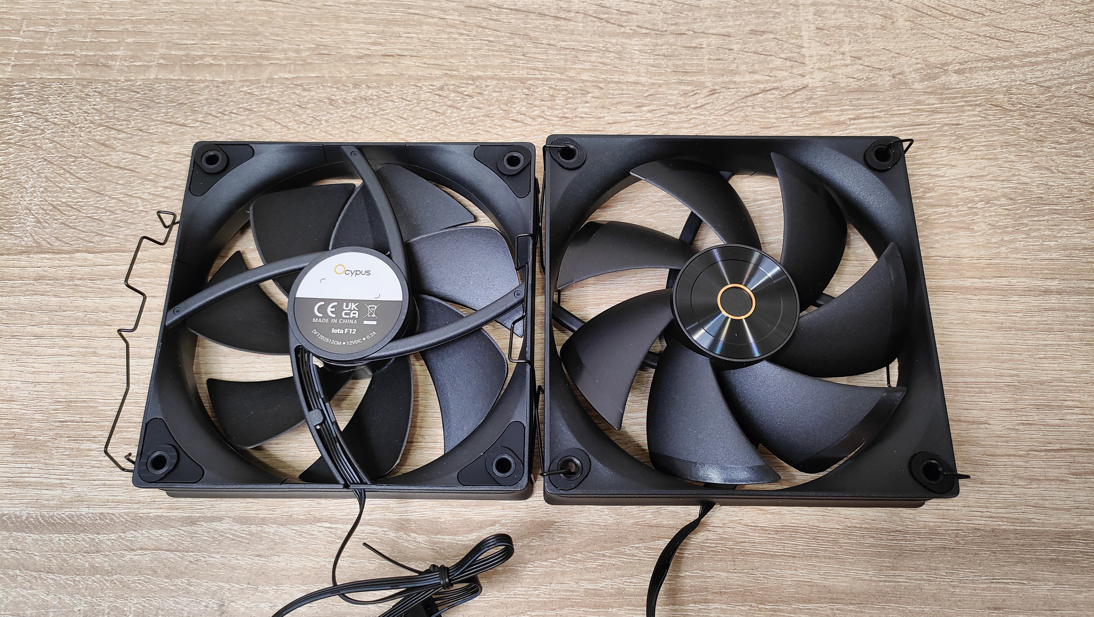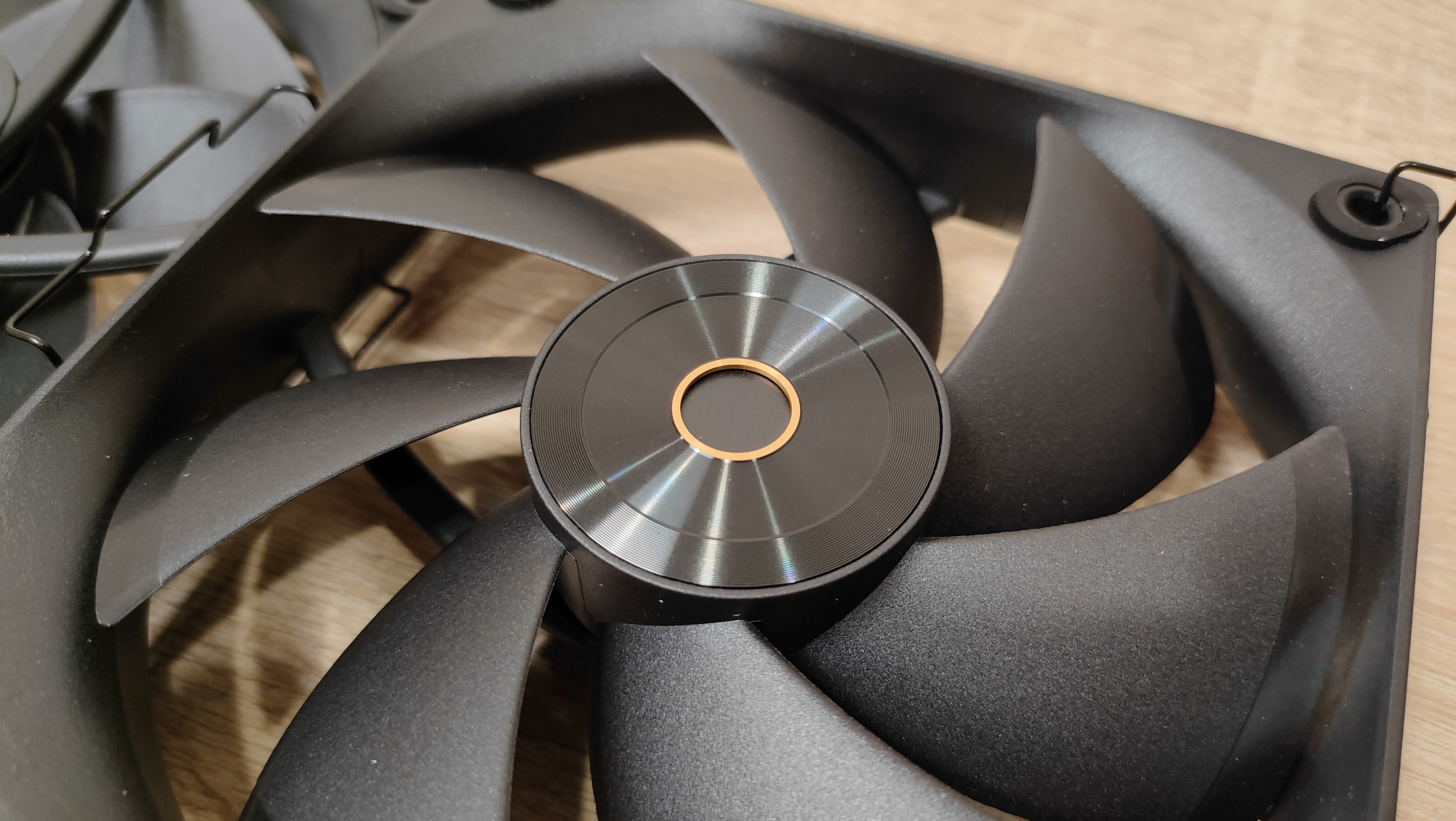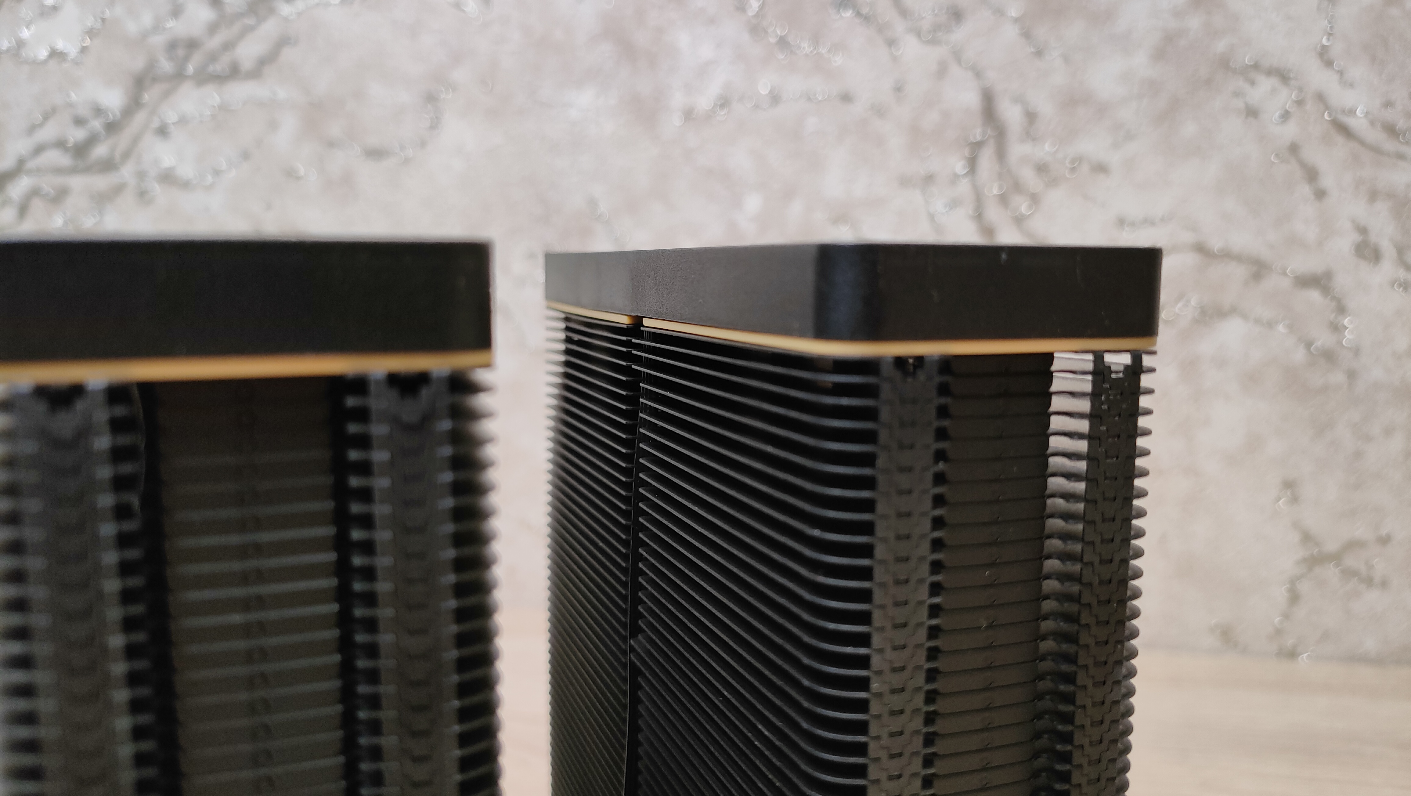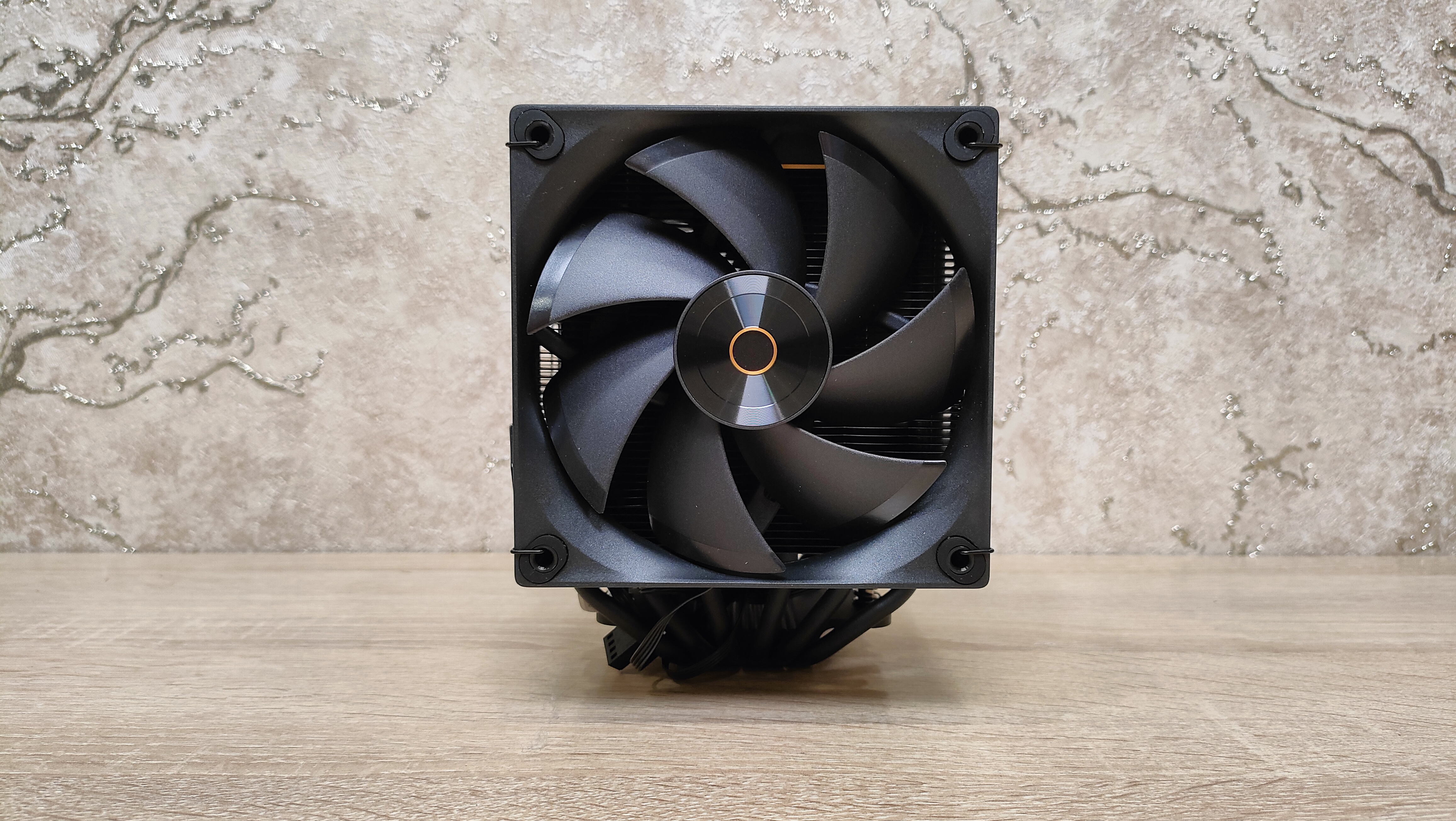 Вентиляторы уже установлены на радиаторе, но при монтаже кулера из все равно пришлось бы снимать, так что можно осмотреть их. Но чего-то принципиально нового из внешний вид не сообщает, надо смотреть на результат совместно работы с радиатором, может они сверхтихие или сверхшумные. Но это не значит, что вентиляторы это пластиковый нонейм, у них есть антивибрационные втулки, где крепятся скобы и в целом строгий внешний вид с жёлтым кольцом на роторе, как часть общего стиля всей системы охлаждения. Подсветки нет нигде, это где-то даже плюс. Маркировка очень похожа на ту, что используется у Deepcool, собственно, в целом кулер тоже чем-то напоминает их продукцию, возможно, корни ведут к одному заводу.