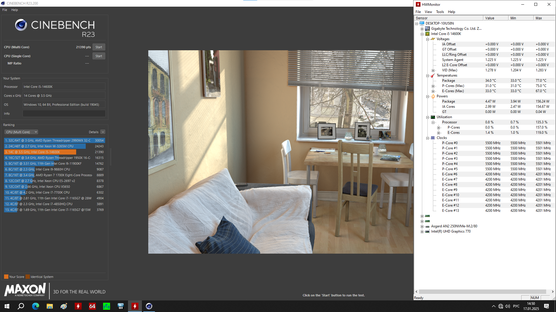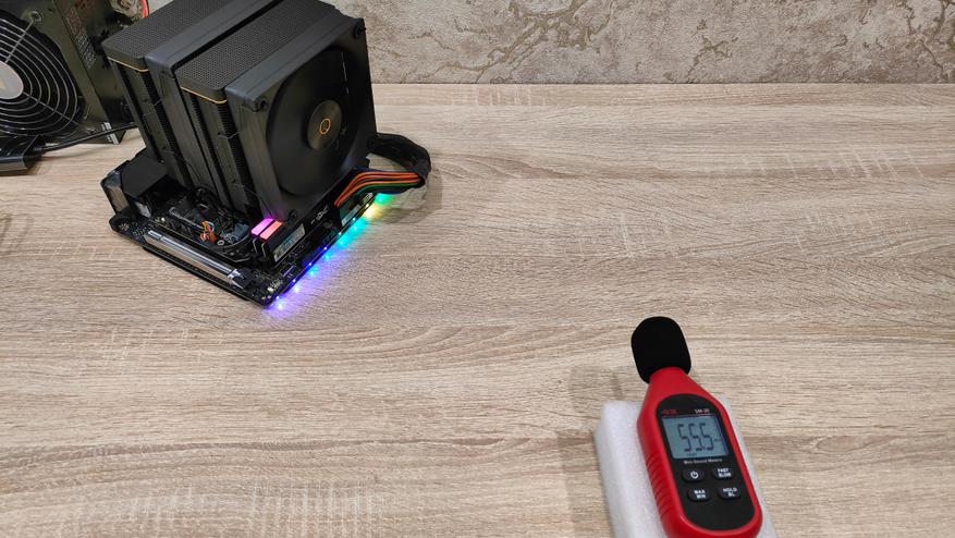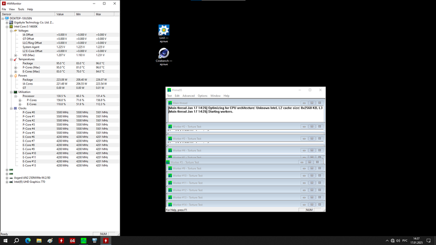 Тестовый стенд в моем случае будет плата с процессором i5-14600K у которого зафиксированы частоты 5.5 и 4.2 ГГц для P и E-ядер соответственно. Нагружать буду программой Prime95, в течение 10 минут. Обороты выставлены на максимальные.