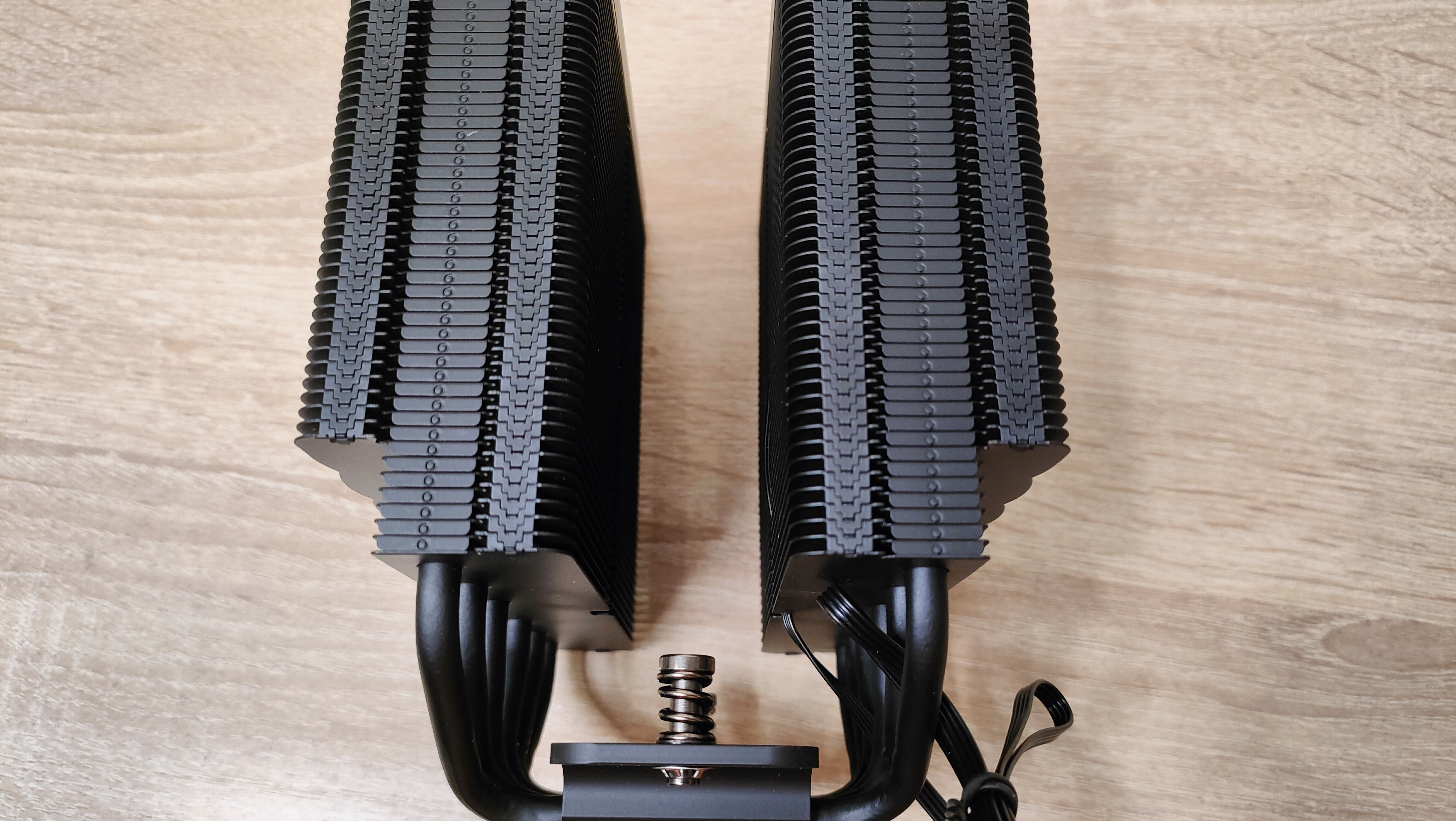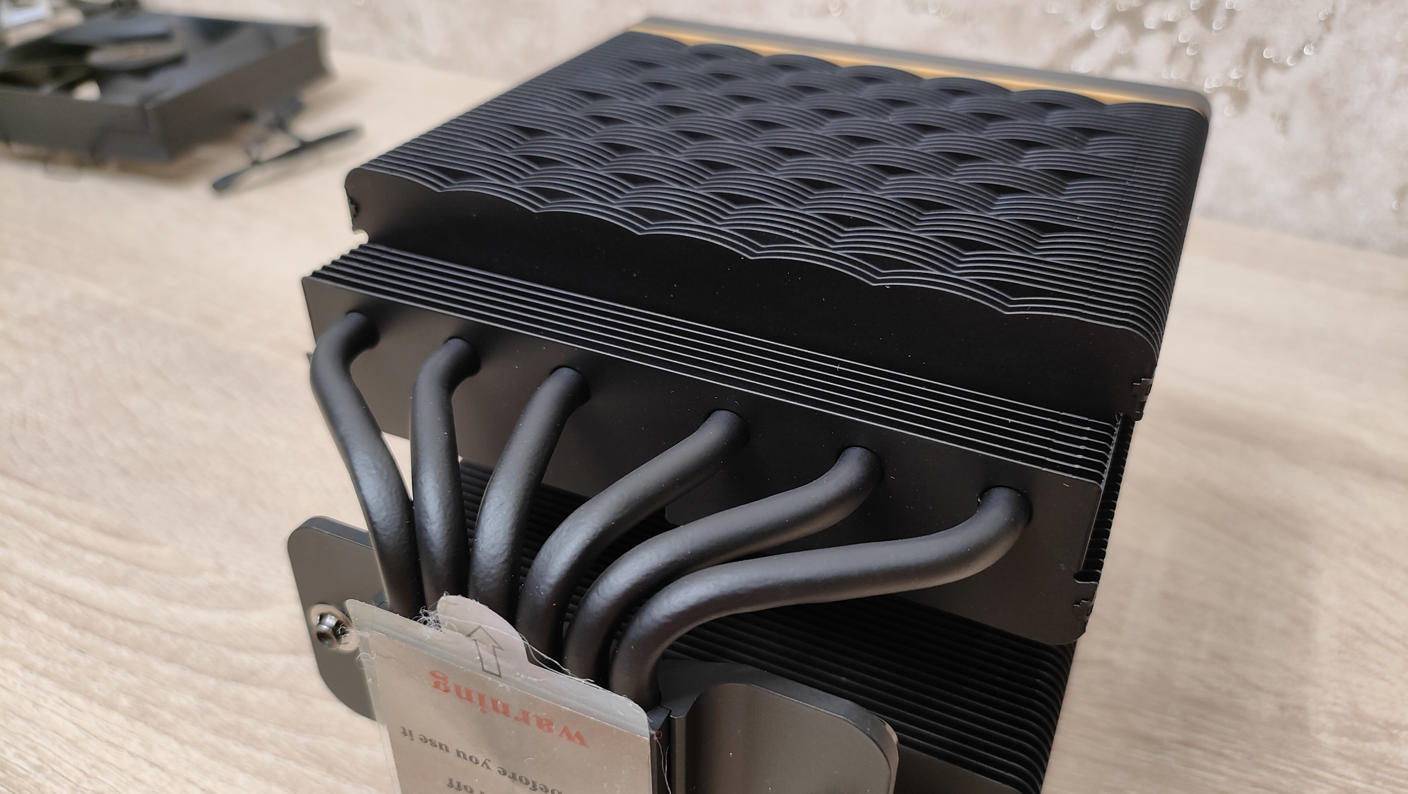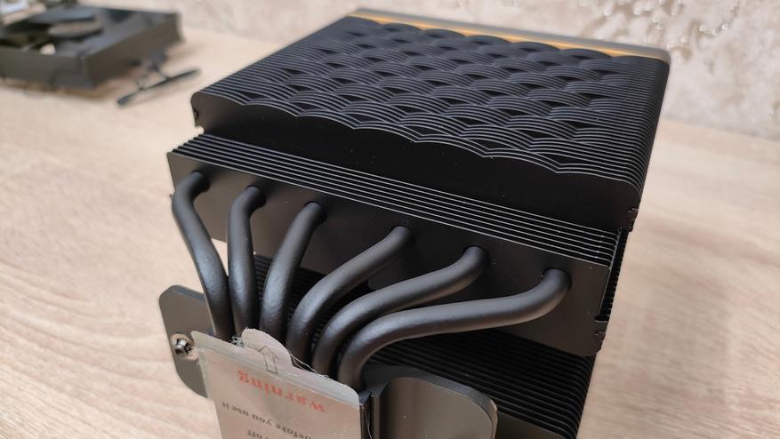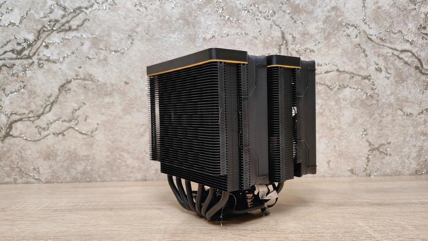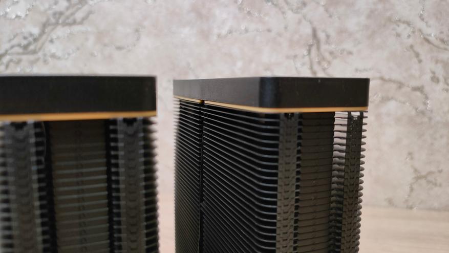 Радиатор состоит из двух секций радиатора, как уже говорилось, каждая по 50 пластины, которые обжаты на 6 медных тепловых трубках диаметром 6 мм. Семь нижних пластин имеют уменьшенную глубину для большей совместимости с радиаторами питания, а также с модулями памяти.