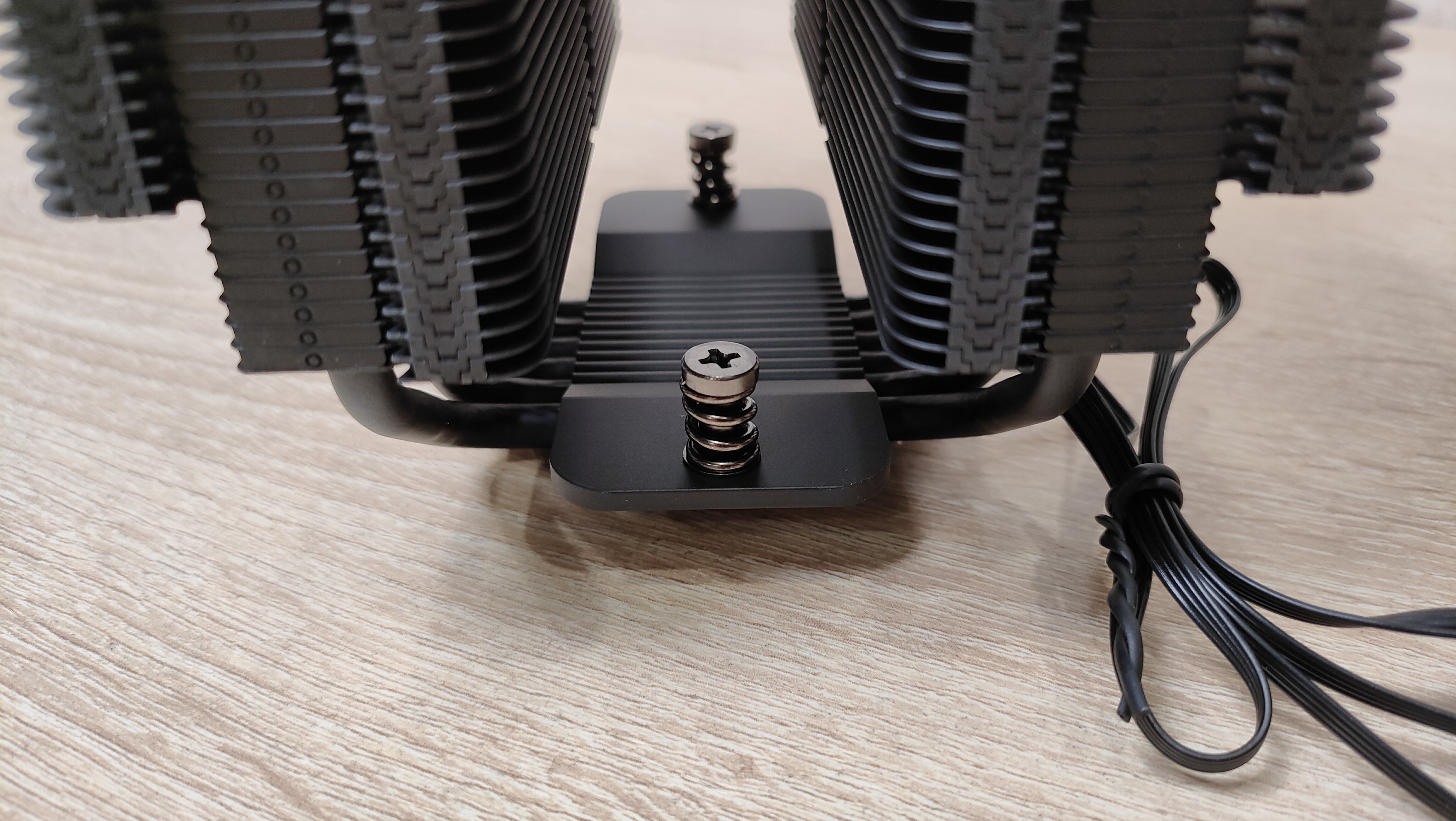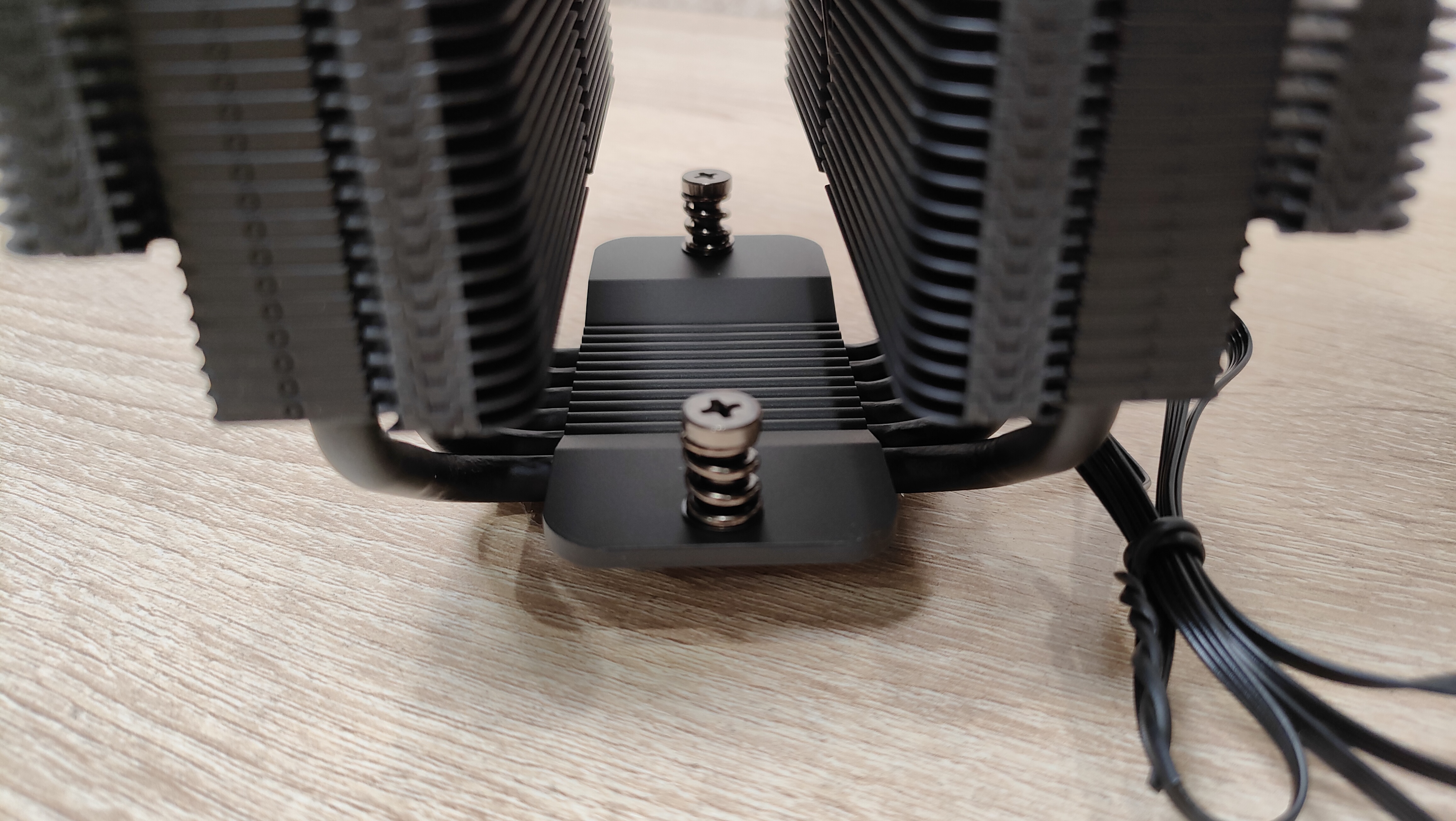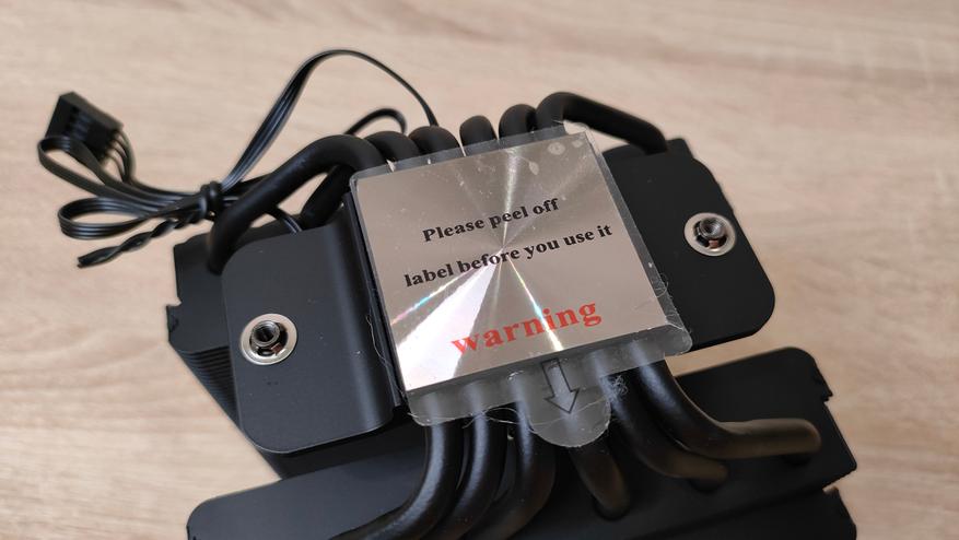 Медные трубки проходят через медное основание и образуют контакт именно через теплосъемник, через основание, никакого прямого контакта. Более того, небольшой след припоя дает не иллюзорный намек на то, что к основанию они припаяны, хотя бы точечно. Основание никелированное, а весь остальной радиатор крашенный черным цветом. Над ним (основанием) есть очень маленький радиатор, даже не так, просто оребрение, которое чуть разгрузит термически это самое основание.