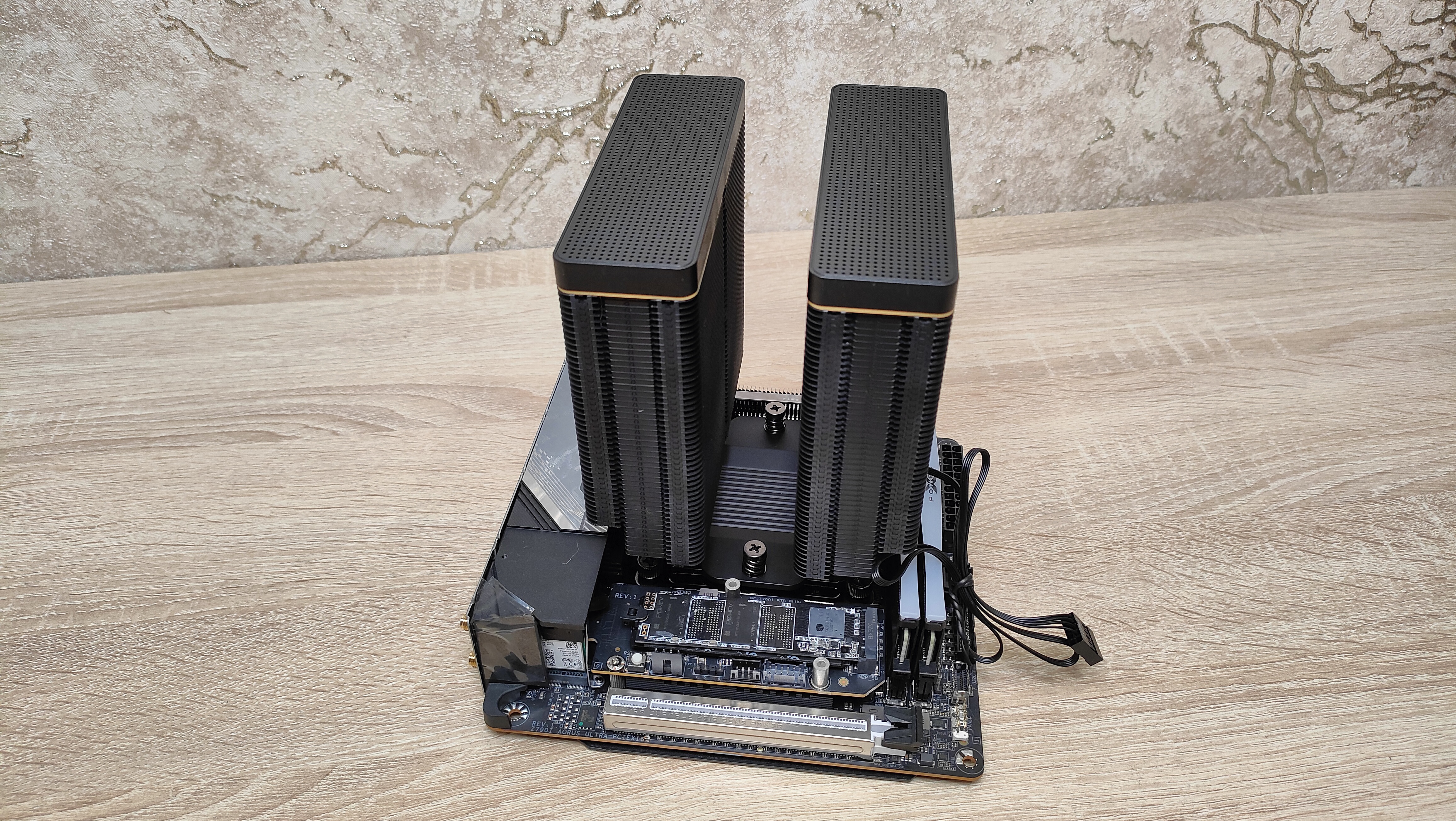 Затем можно нанести термопасту, с основания кулера снять защитную пленку и установить его на процессор и закрутить винты. На этом все, далее только навесить вентиляторы, а также подключить все провода.