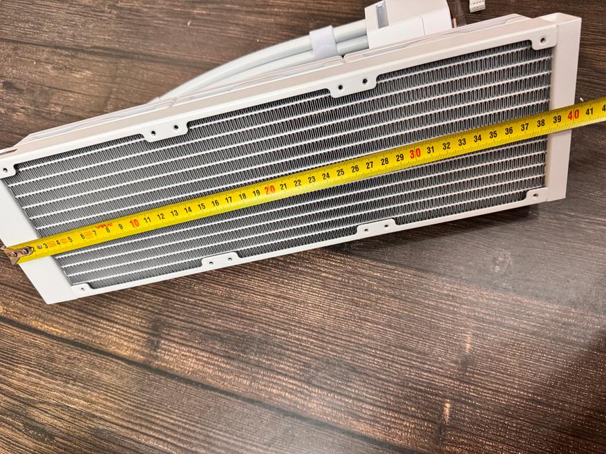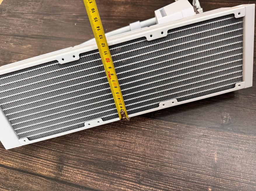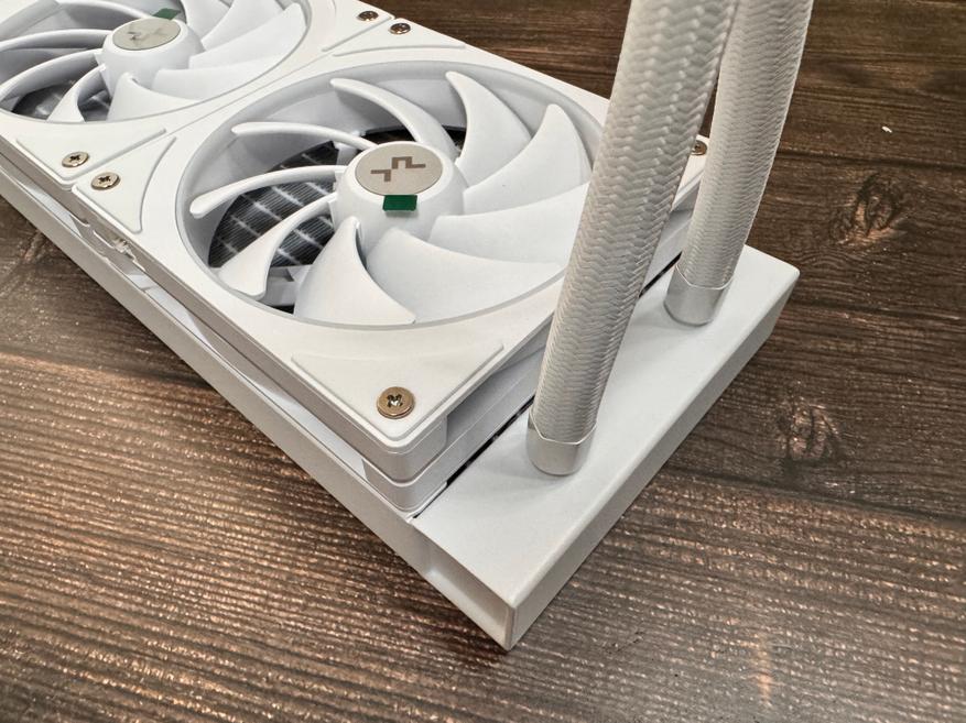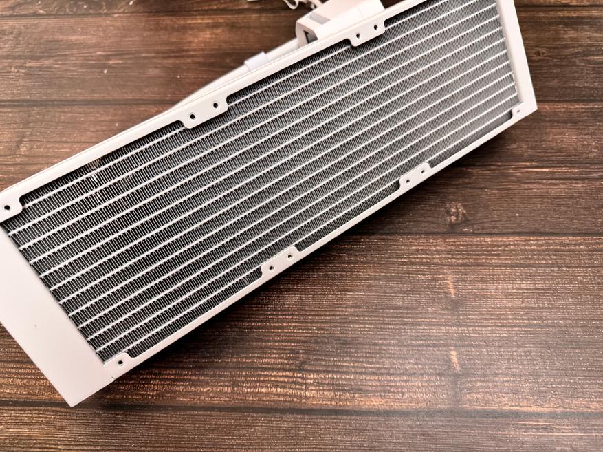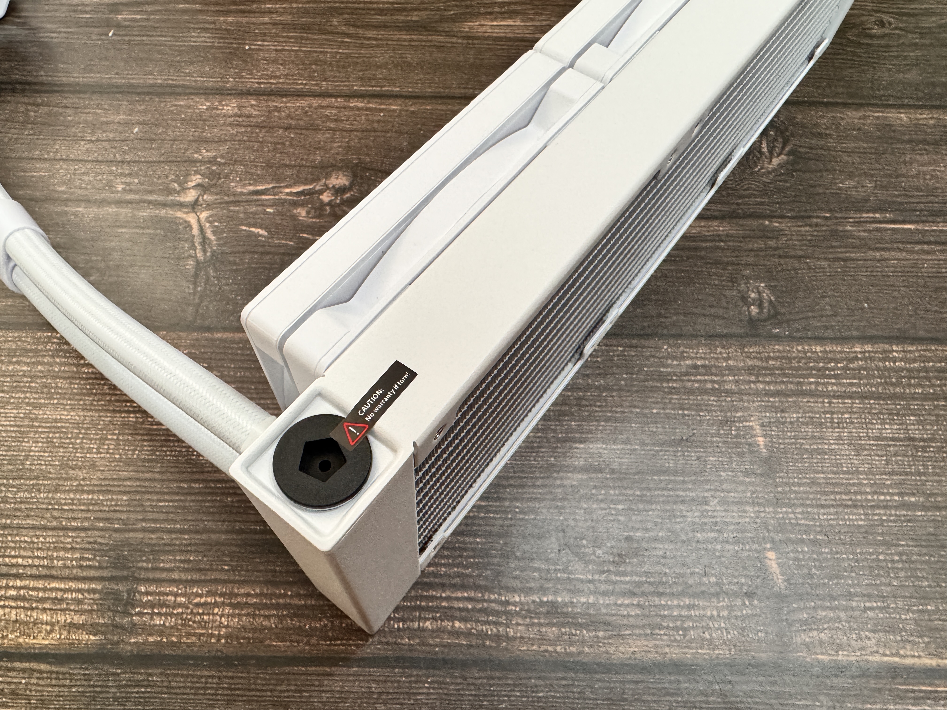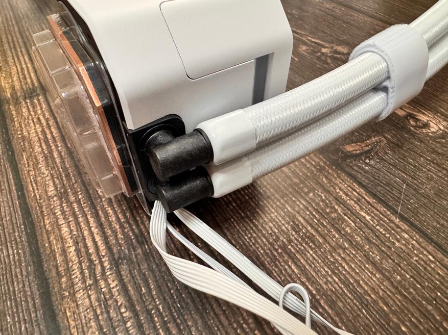 Радиатор охлаждения представлен в классическом виде и имеет Z-образным рисунок ребер. Радиатор выполнен из алюминия и имеет 12 каналов. Ребра радиатора достаточно плотно приближены друг к другу и для хорошей продувки потребуются хорошие вентиляторы с достаточным воздушным потоком. С боковой стороны имеется предохранительный клапан Anti-leak, который выравнивает внутреннее давление в системе во избежание протечек. Данный клапан имеет гарантийную пломбу, которую не рекомендуется срывать, так как гарантия при этом моментально аннулируется. Для соединения радиатора и помпы используются стандартные шланги в тканевой оплетке. Фитинги используются металлические, как и обжимные кольца. В комплекте с СЖО имеются две мягкие стяжки с липучкой, которые используются для фиксации шлангов. Вентиляторы подключаются последовательно при помощи 7 PIN разъема, а затем при помощи 4 PIN разъема к материнской плате. Белоснежные вентиляторы FL12 SE работают на гидродинамическом подшипнике и имеют регулировку оборотов от 400~2400 об/мин. Вентиляторы обеспечивают хороший воздушный поток 66,23 куб/мин.