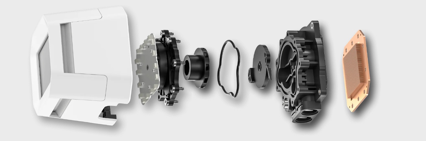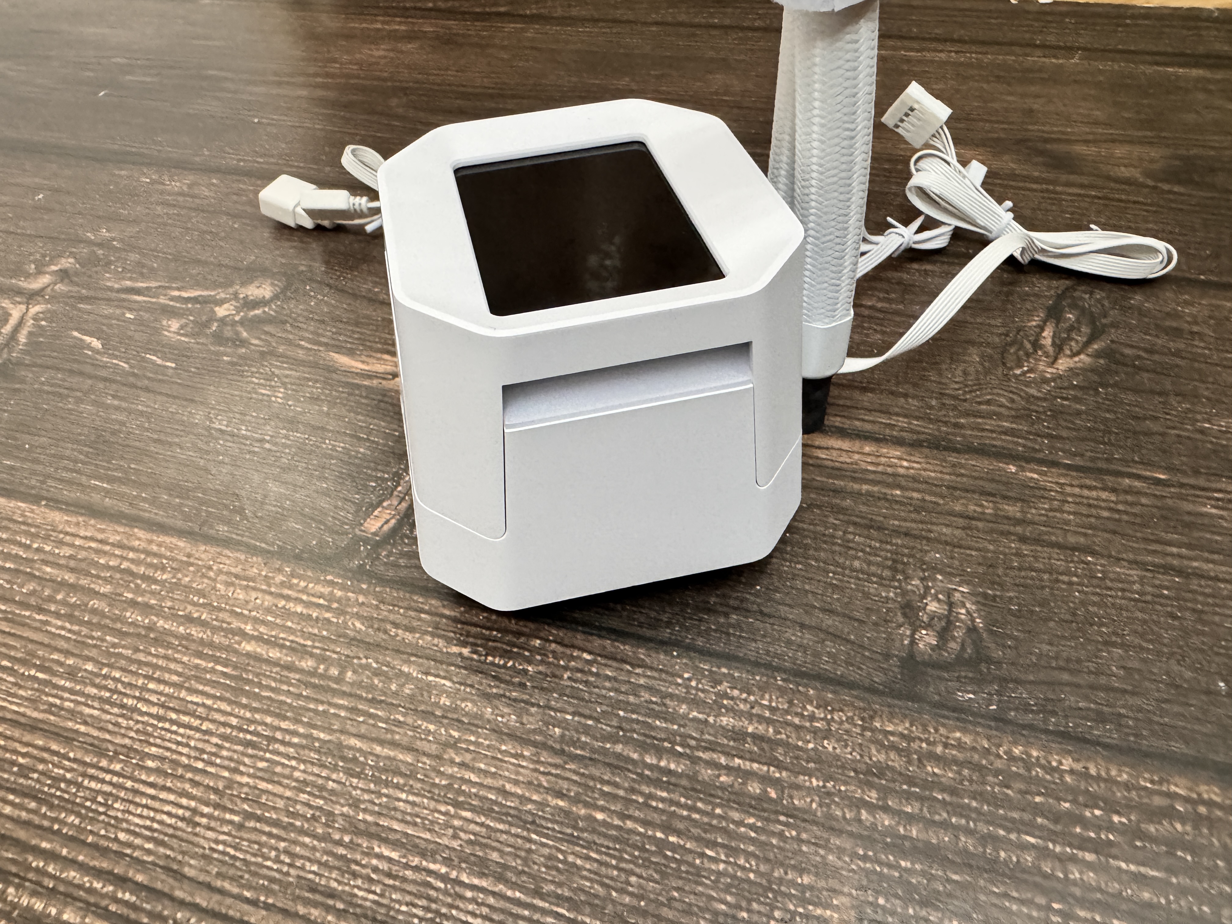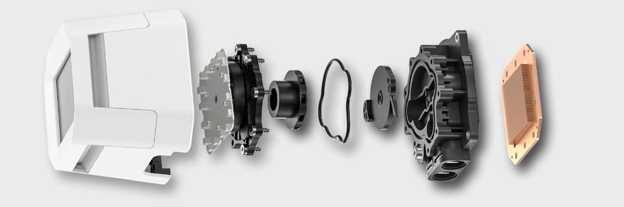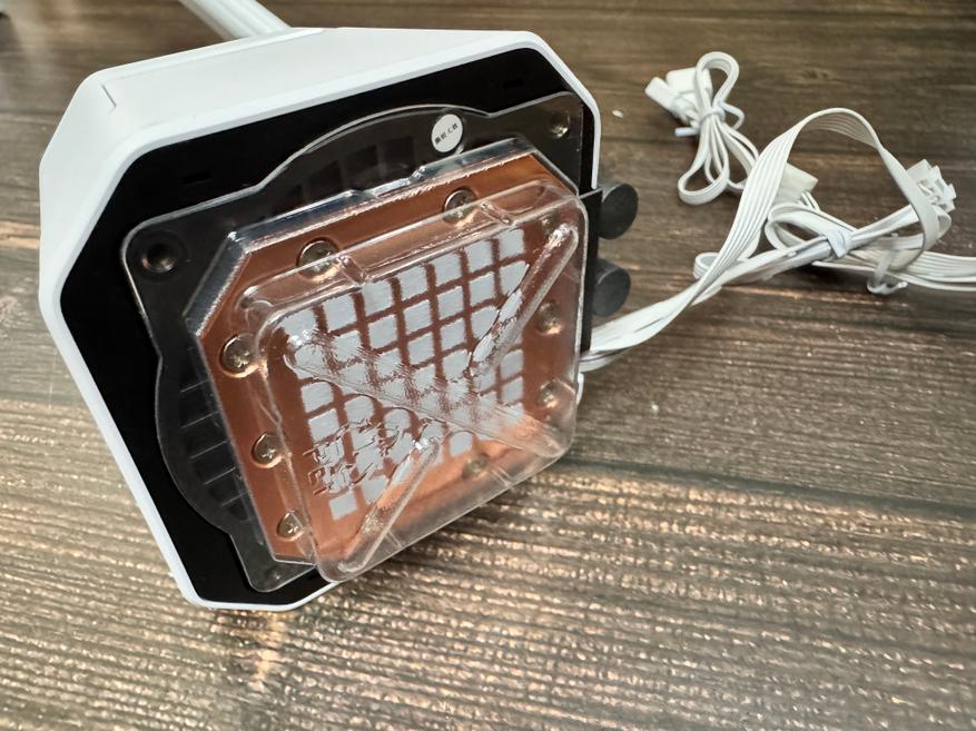 Со стороны водоблока используются пластиковые Г-образные поворотные фитинги, которые обеспечивают комфорт при монтаже системы охлаждения. Корпус водоблока имеет весьма интересную форму (усеченной пирамиды), на верхней части которой имеется дисплей 2,4 дюйма с разрешением 320 x 240 точек. Со всех сторон корпуса имеются декоративные отверстия, в которых находится подсветка. Внутри корпуса установлена современная помпа 6-го поколения со скоростью вращения 3600 об/мин. Помпа подключается к материнской плате при помощи 4 PIN для питания и изменение оборотов, 3 PIN для подсветки и USB разъем для отображения информации на дисплее.