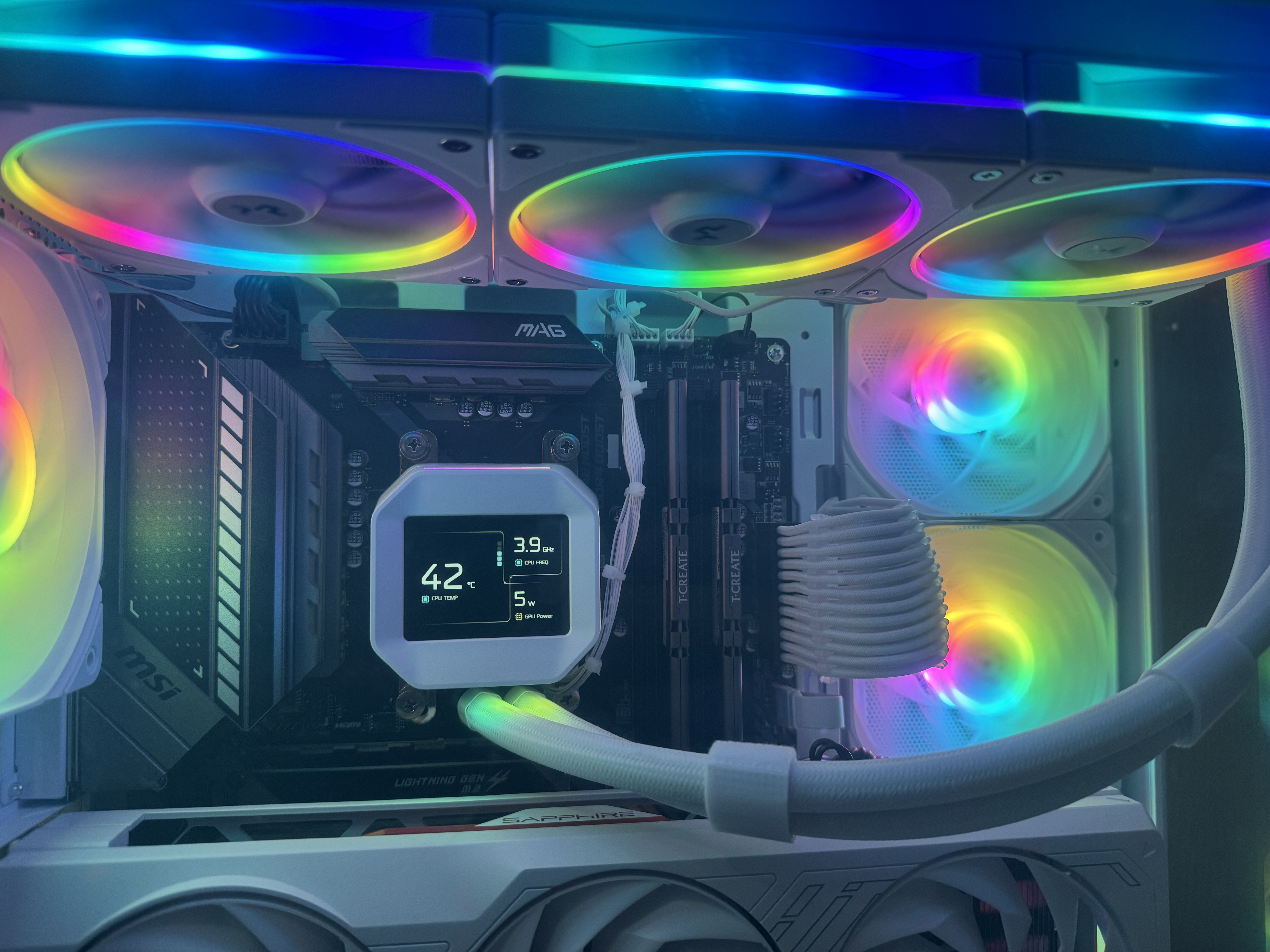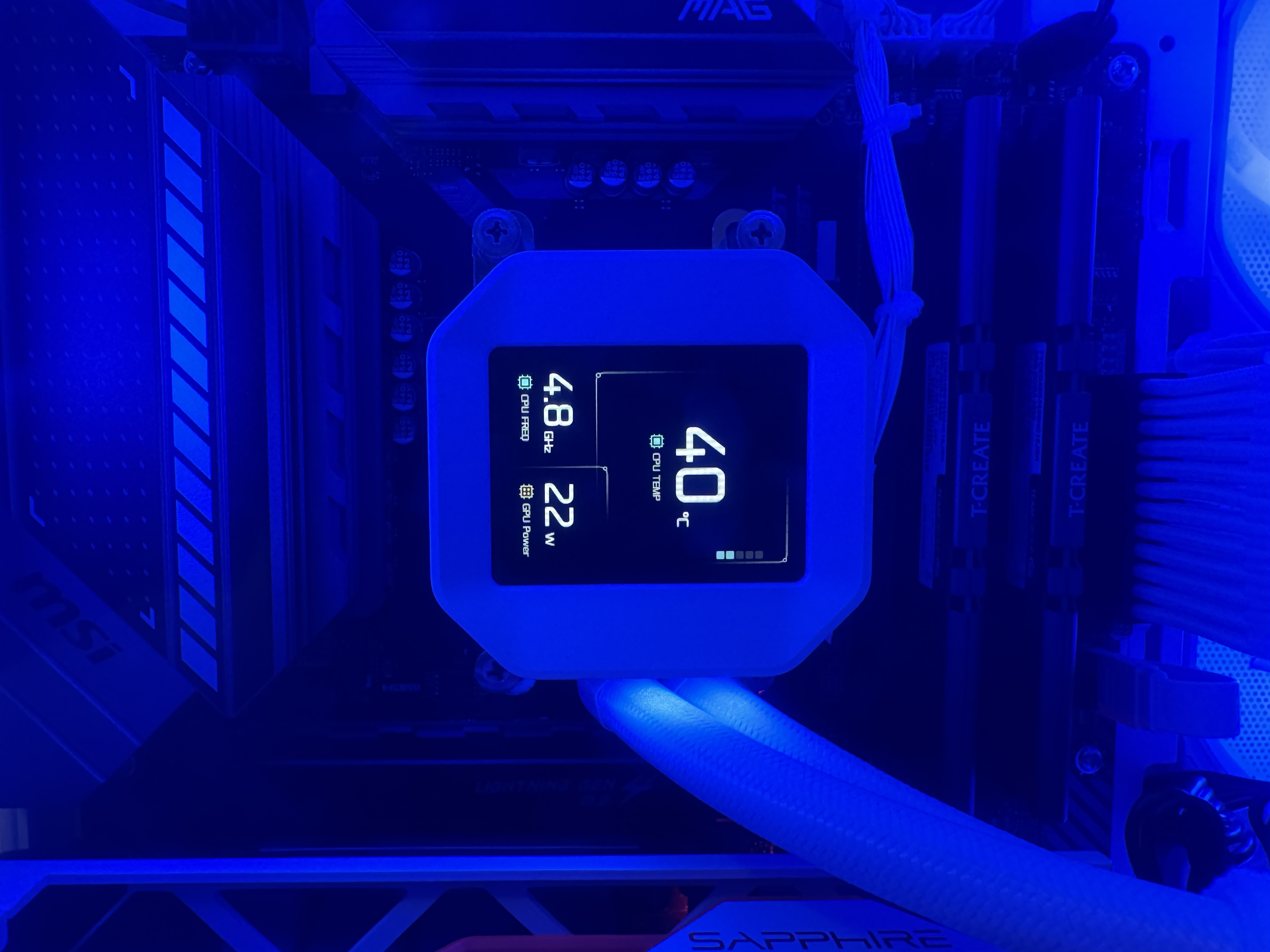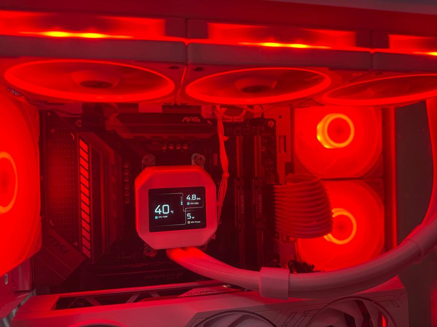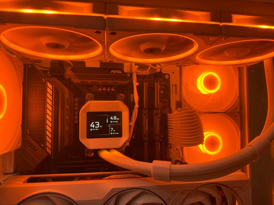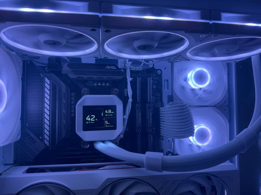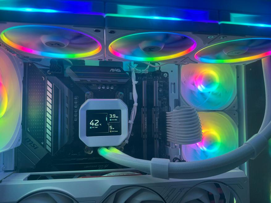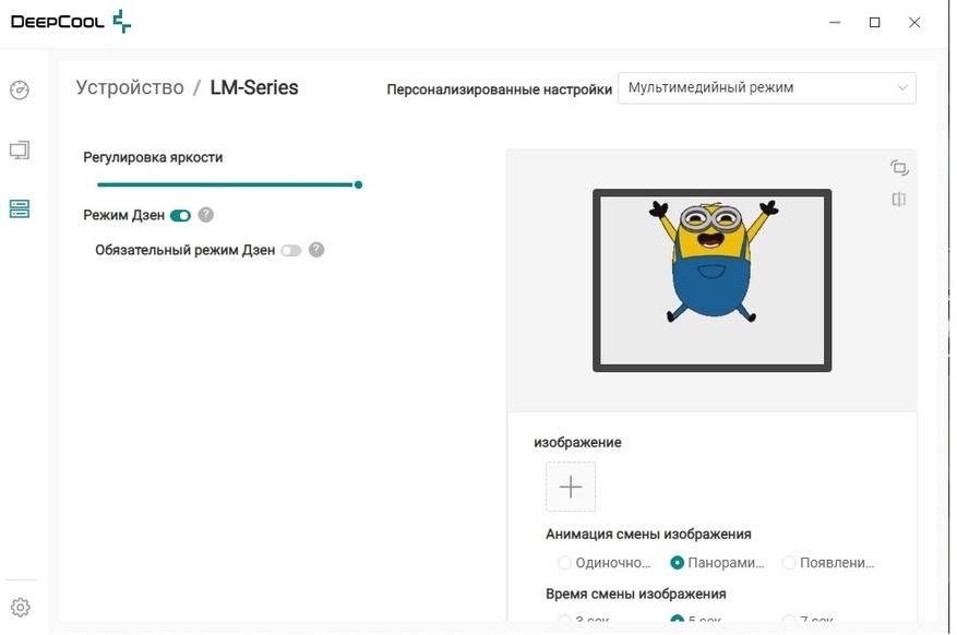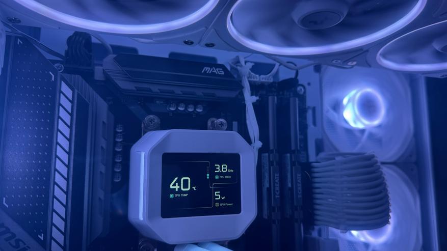 Жидкостная система охлаждения работает прям из коробки, но для работы дисплея на водоблоке, потребуется установить официальное программное обеспечение. Для того чтобы необходимая информация выводилась на дисплей, пользователю будет необходимо подключить кабель USB в разъем на материнской плате. После установи ПО, нам предлагается настроить интерфейс на свое усмотрение, это может быть как обычные цифровые показатели температуры, потребление, рабочая частота или же красивые картинки или даже видео GIF. Главное меню ПО разделено на 3 вкладки: первая вкладка — включает в себя полный список мониторинга всех доступных систем, вторая вкладка — включает в себя полное описание всех установленных компонентов, третья вкладка — содержит все настройки связанные с выводом информации на дисплей.