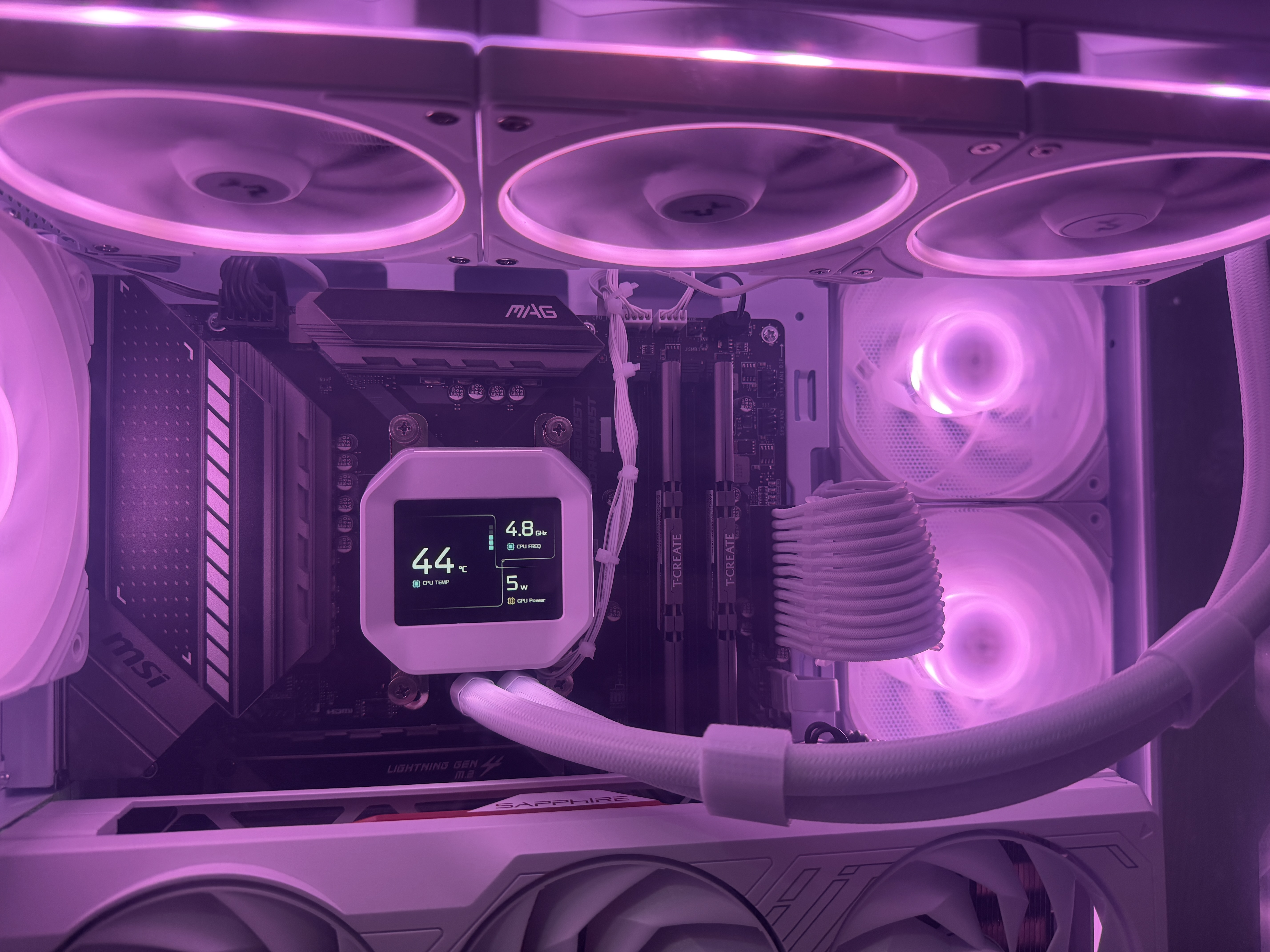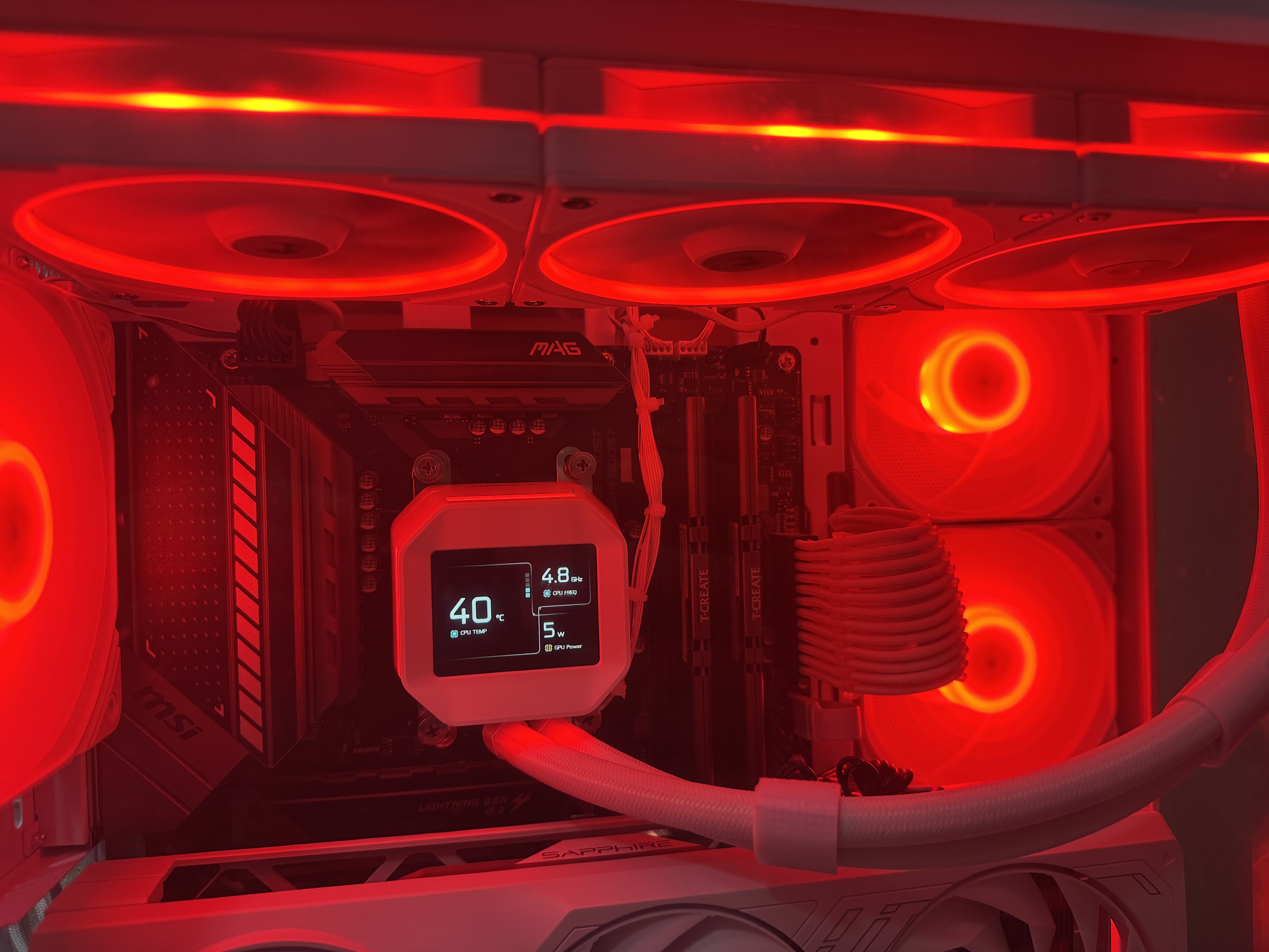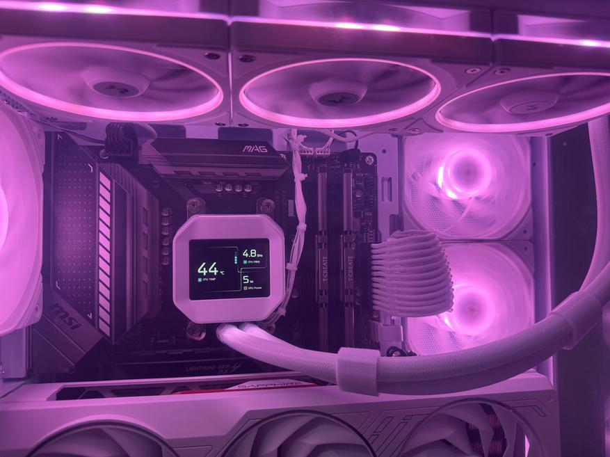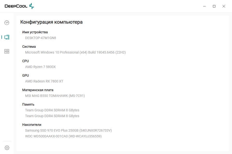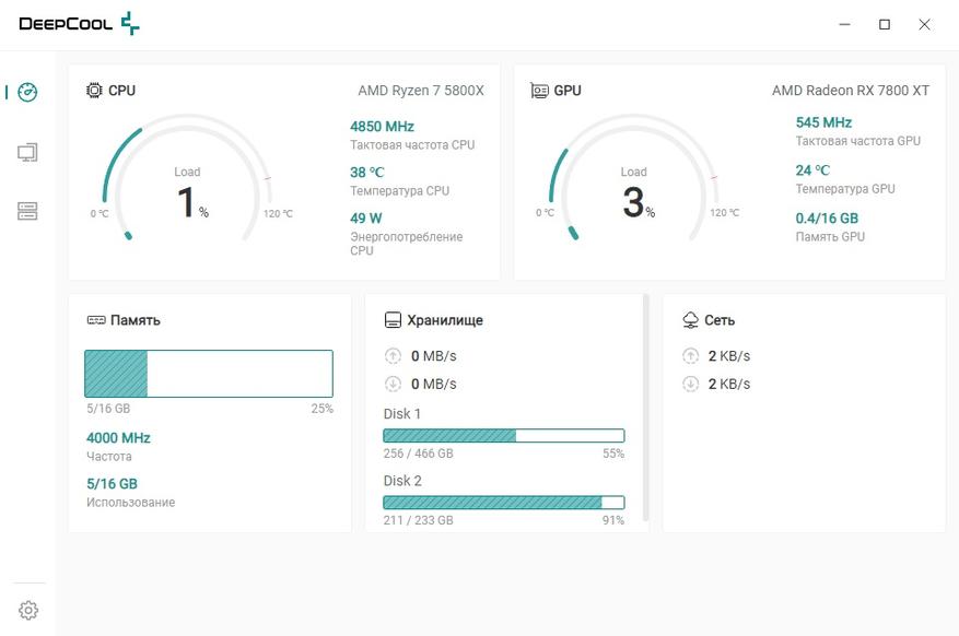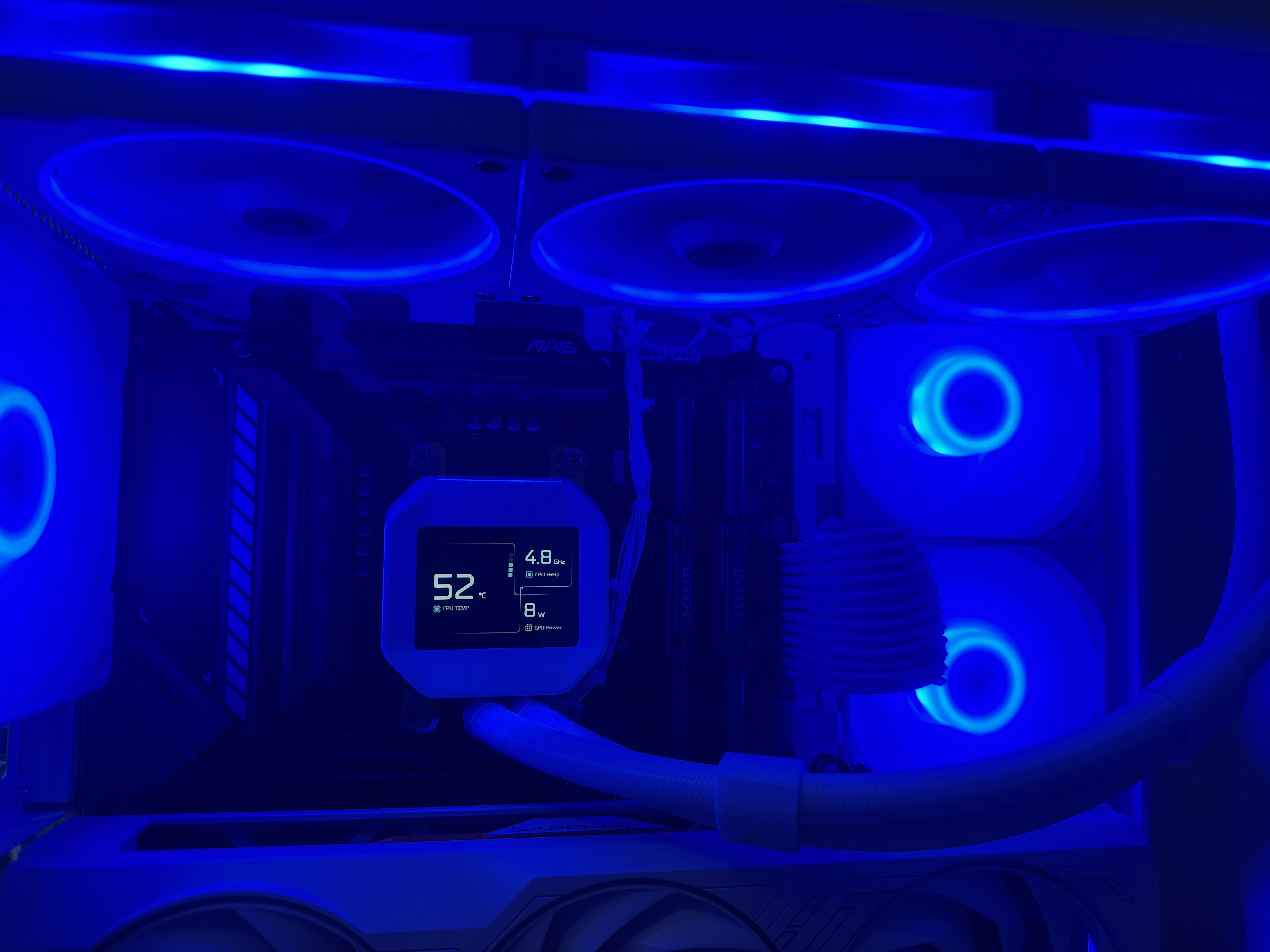 Жидкостная система охлаждения работает прям из коробки, но для работы дисплея на водоблоке, потребуется установить официальное программное обеспечение. Для того чтобы необходимая информация выводилась на дисплей, пользователю будет необходимо подключить кабель USB в разъем на материнской плате. После установи ПО, нам предлагается настроить интерфейс на свое усмотрение, это может быть как обычные цифровые показатели температуры, потребление, рабочая частота или же красивые картинки или даже видео GIF. Главное меню ПО разделено на 3 вкладки: первая вкладка — включает в себя полный список мониторинга всех доступных систем, вторая вкладка — включает в себя полное описание всех установленных компонентов, третья вкладка — содержит все настройки связанные с выводом информации на дисплей.
