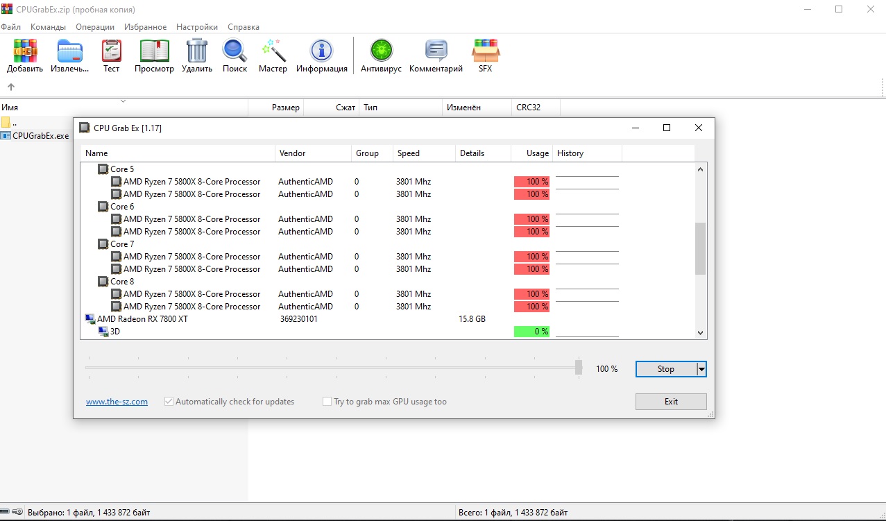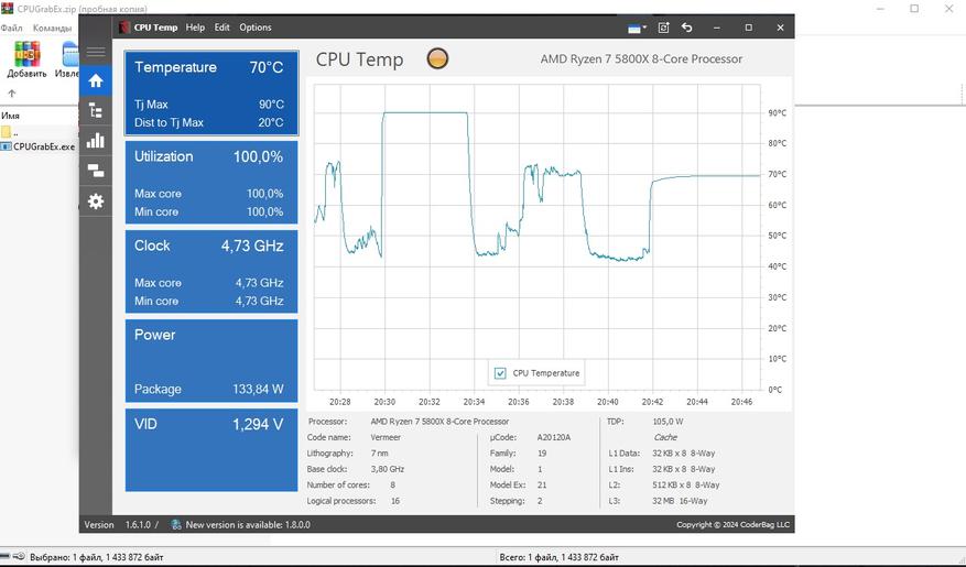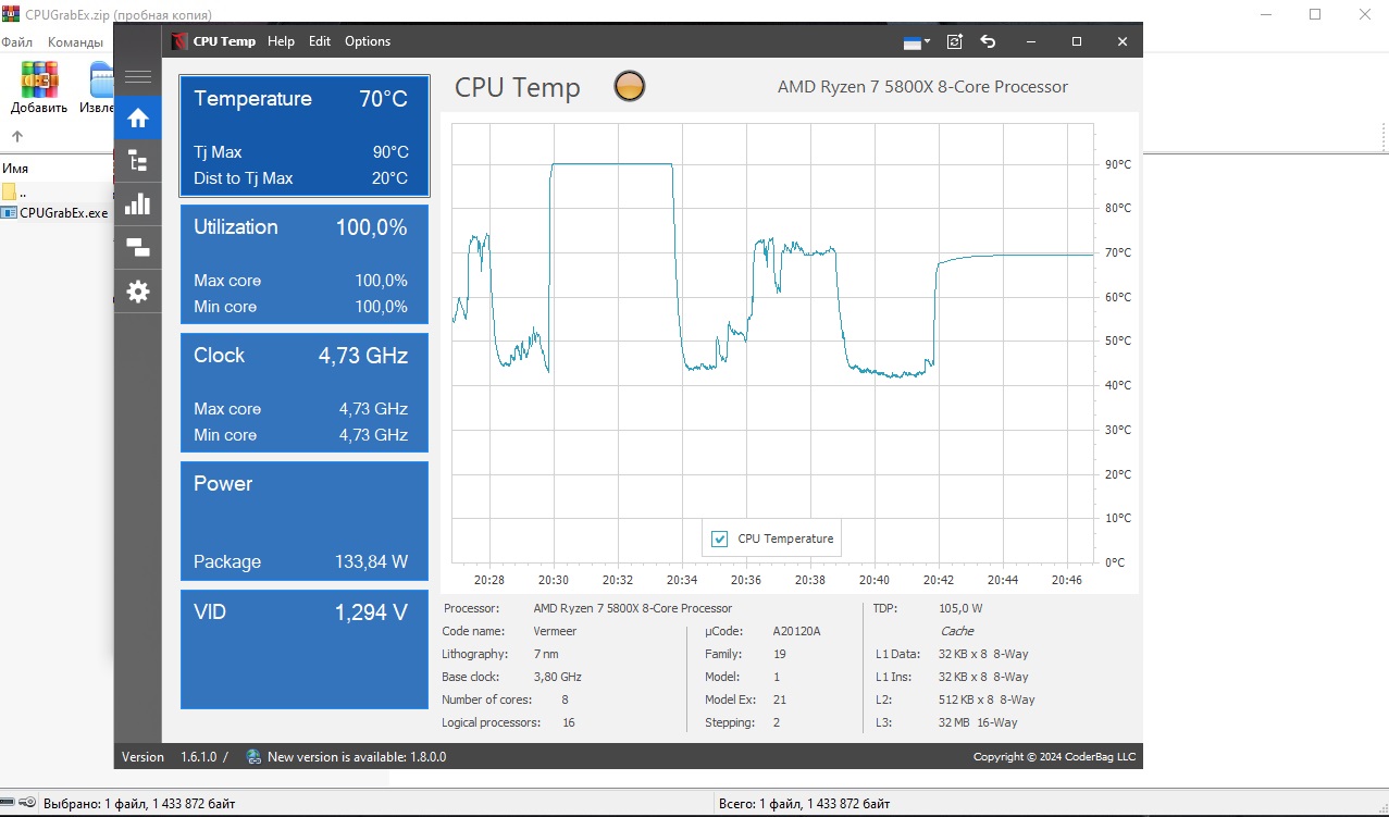 Утилита CPU Grab EX — 133 Вт — температура 70 градусов.