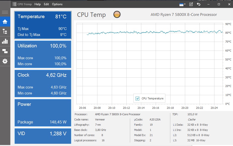 Утилита AIDA 64 — 148 Вт — температура 81 градус.