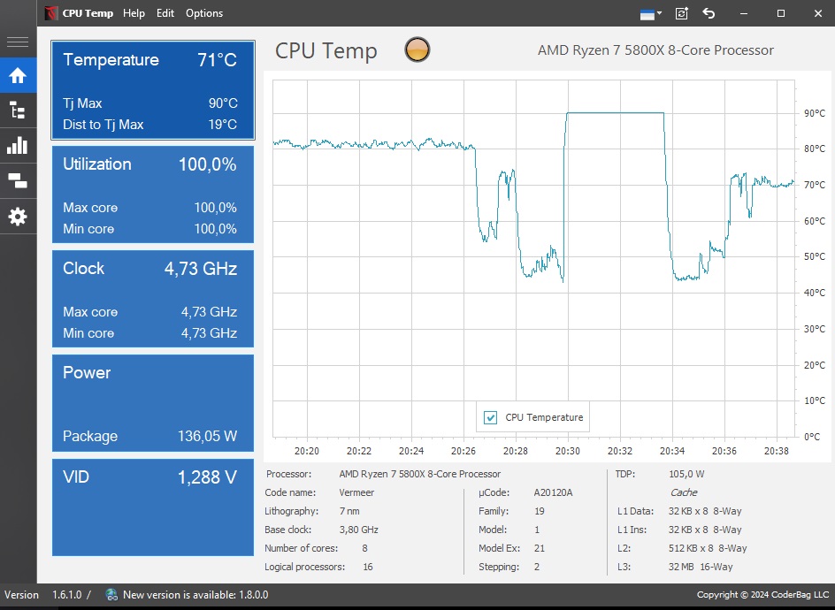 Утилита Cinebench 2024 — 136 Вт — температура 71 градус.