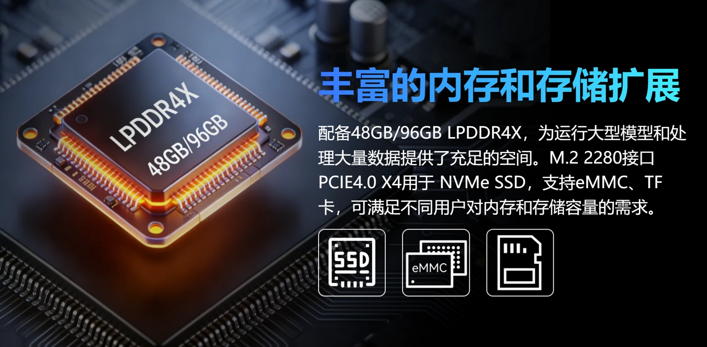 Производитель предусмотрел два варианта конфигурации оперативной памяти стандарта LPDDR4X — 48 ГБ и 96 ГБ. Для хранения данных доступна встроенная память eMMC объёмом до 256 ГБ. Устройство также поддерживает карты MicroSD и твердотельные накопители формата M.2 с подключением через интерфейс PCIe.