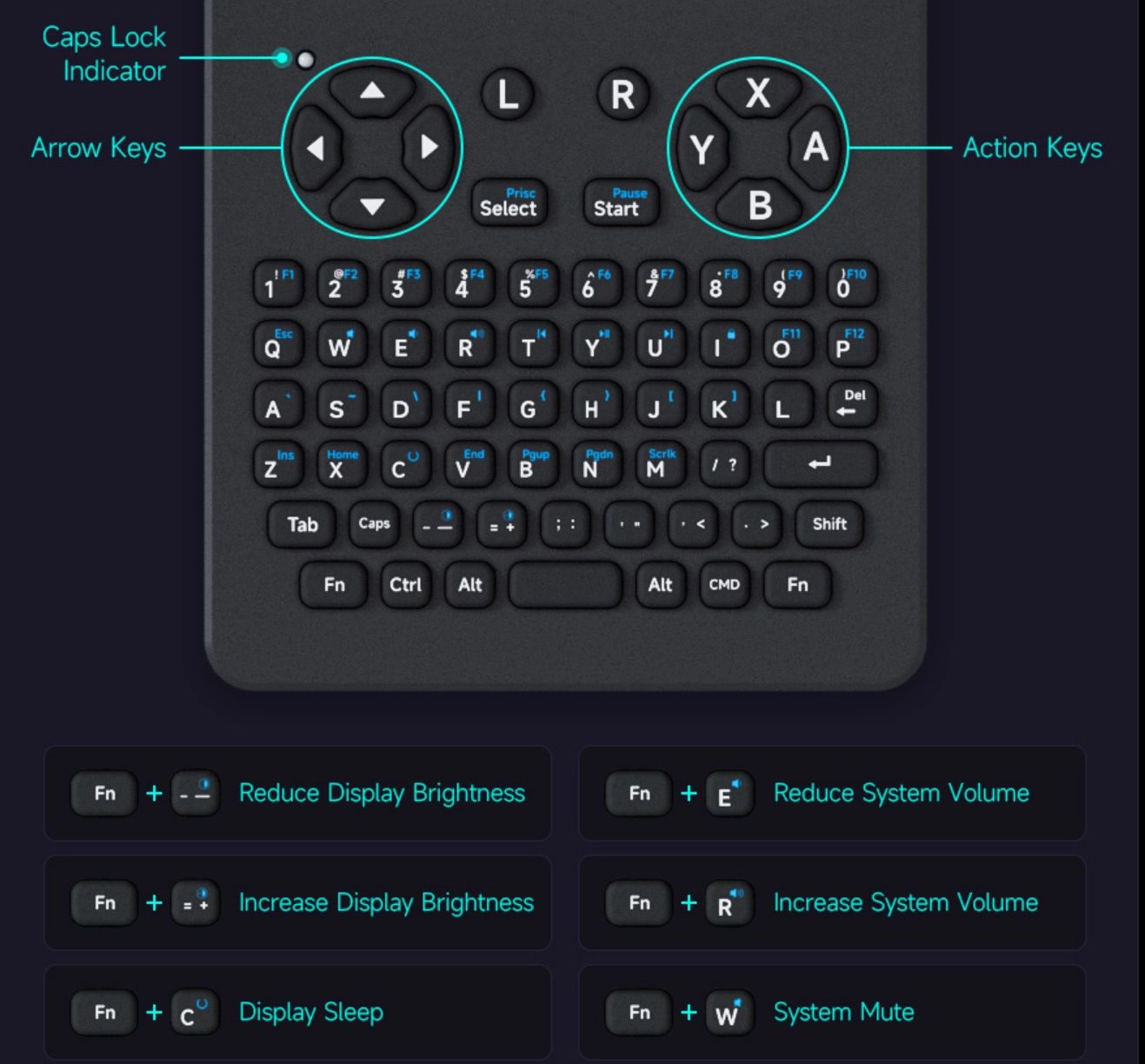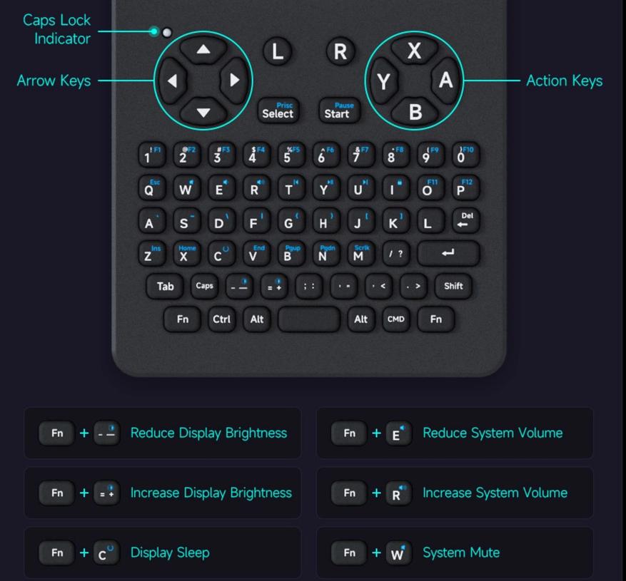 Клавиатура устройства выполнена из силикона и позволяет вводить цифры без использования клавиши FN. Также предусмотрены навигационные стрелки и блок кнопок ABXY, что делает возможным запуск ретро-игр. За автономность отвечает аккумулятор емкостью 5000 мАч.