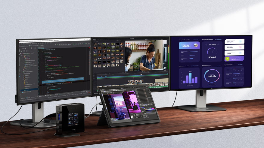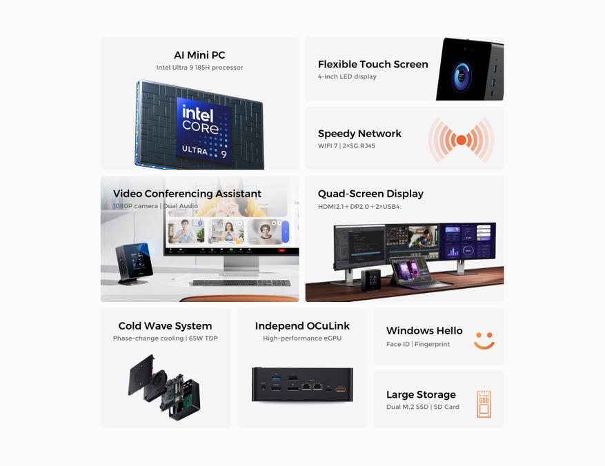 Этот мини-ПК оснащен двухканальной высокочастотной памятью DDR5 с частотой 5600 МГц, поддерживающей объем до 96 ГБ. Он включает в себя два слота для SSD-накопителей M.2 PCIe 4.0 и слот для карт расширения SD со скоростью до 60 МБ /с, что удовлетворяет потребности кинематографистов и творческих работников в хранении данных.
