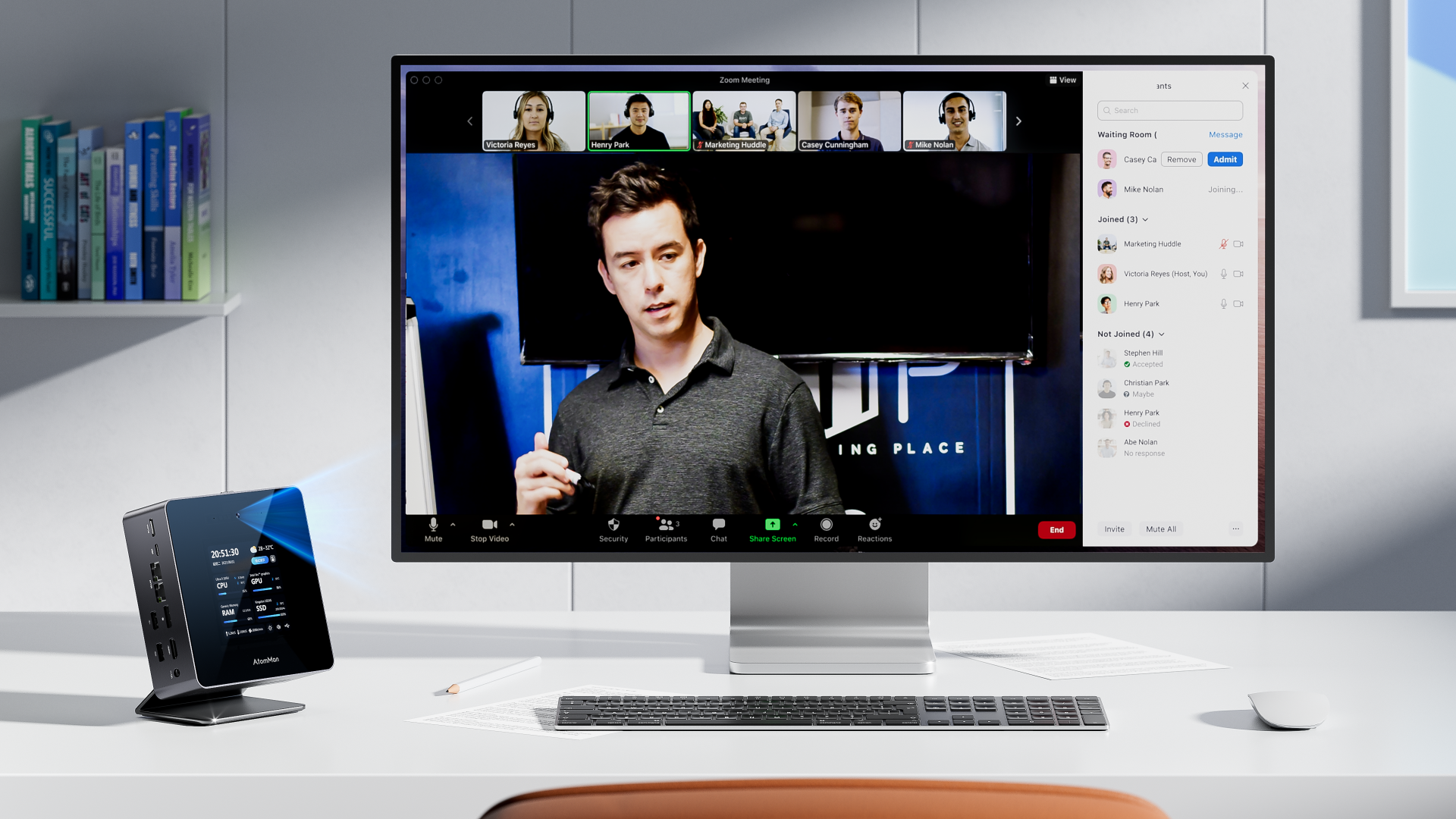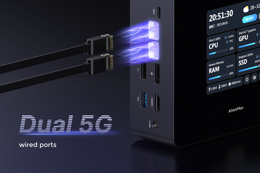 AtomMan X7 Ti оснащен 4-дюймовым сенсорным экраном, поддерживающим мониторинг системы, настройку производительности, отображение времени и настраиваемые темы оформления. Он оснащен HD-камерой с разрешением 1080P и физическим переключателем для защиты конфиденциальности, поддерживает Windows Hello и студийные эффекты и может регулироваться по углу наклона с помощью подставки. В сочетании с двумя цифровыми микрофонами он обеспечивает отличную совместную работу при проведении видеоконференций.