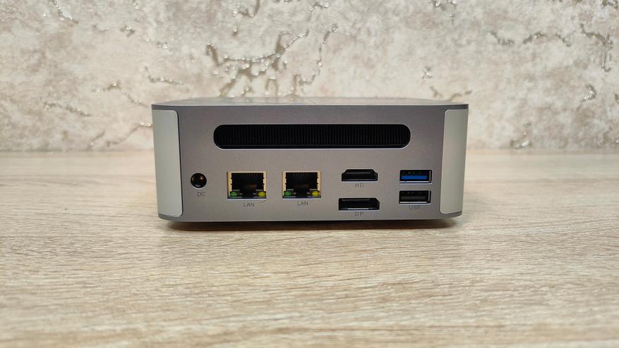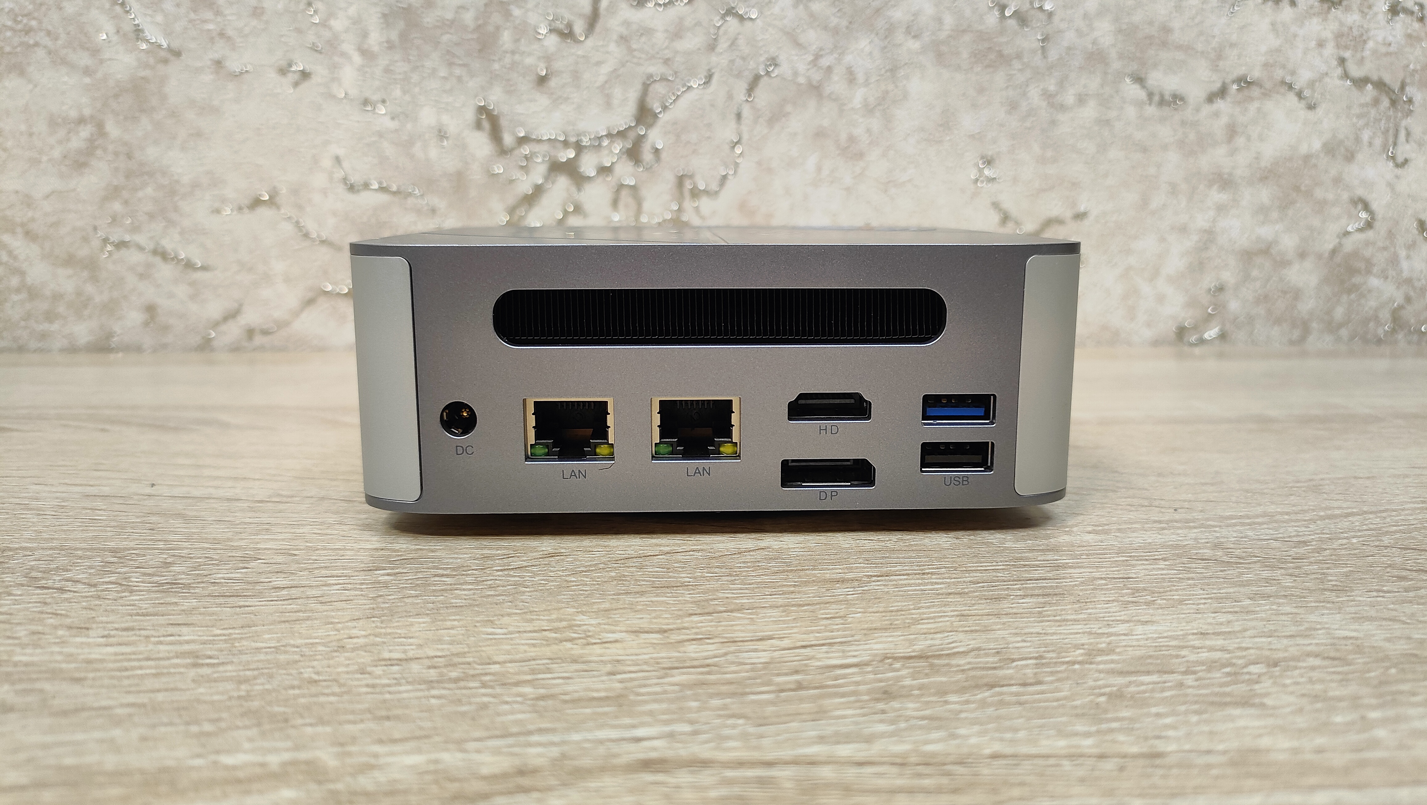 На передней панели есть: 2*USB 3.2 Gen2, USB-C 3.2 Gen2 (полнофункциональный, в том числе с питанием), комбо-миниджек, кнопка питания и скрытая кнопка сброса. В тылу: разъем питания DC, 2*2.5 Гбит LAN, HDMI, DP, USB 2.0, USB 3.2 Gen2. Итого, общее количество USB здесь равно 5, неплохо.