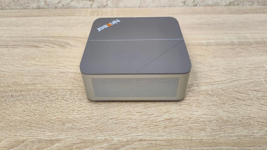 Верхняя крышка пластиковая в сером цвете, разбавлена она логотипом вендора, у которого, кстати, буква K тоже рыжего цвета. Кроме того, на верхней крышке, даже во всю крышку, есть большая, буква N, с тонкими линиям. Поддон тоже пластиковый, серый, у него есть круговой выступ, который выступает в роли ноги, так как у него есть круговая накладка мягкая, в нём же есть воздухозаборники. Возможно, дизайнер нарисовал что-то на тему Mac Mini, так как у него со стороны дна картина чем-то похожа.