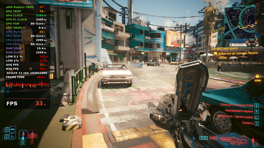 Здесь повторяется ситуация как и была при синтетических тестах, мне кажется, что процессору не дают «расправить крылья», это видно и по результатам бенчмарков, в том числе игровых, а тот же в том, который есть в киберпанке. Но игровая производительность будет страдать также из-за частоты памяти, которые здесь, напомню, 4800 МГц, а не более стандартные 5600. кроме того тестируя миники на DDR5, я со временем обнаружил, что эта память имеет тенденцию к перегреву, что интересно, лучше всего это заметно именно в играх. Если постоять в игре на одном месте, дождаться нагрева памяти, то судя по графикам, которые были в начале теста и в конце можно смело заявлять, что проблема нагрева DDR5 памяти здесь также присутствует, но не так ярко, как я видел это ранее, вероятно, локальная работа процессора тоже сказывается. Так что если есть задача, в которой очень активно используется оперативная память, например, использование встроенного видеоядра, то следует позаботиться о поиске более холодных вариантов памяти.