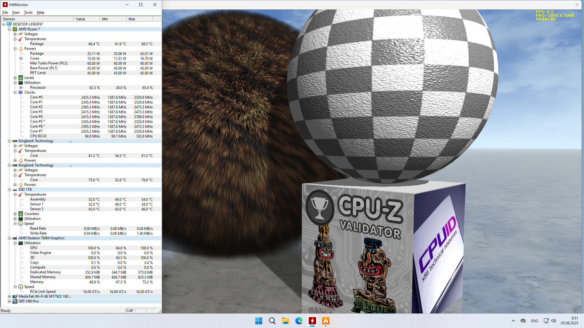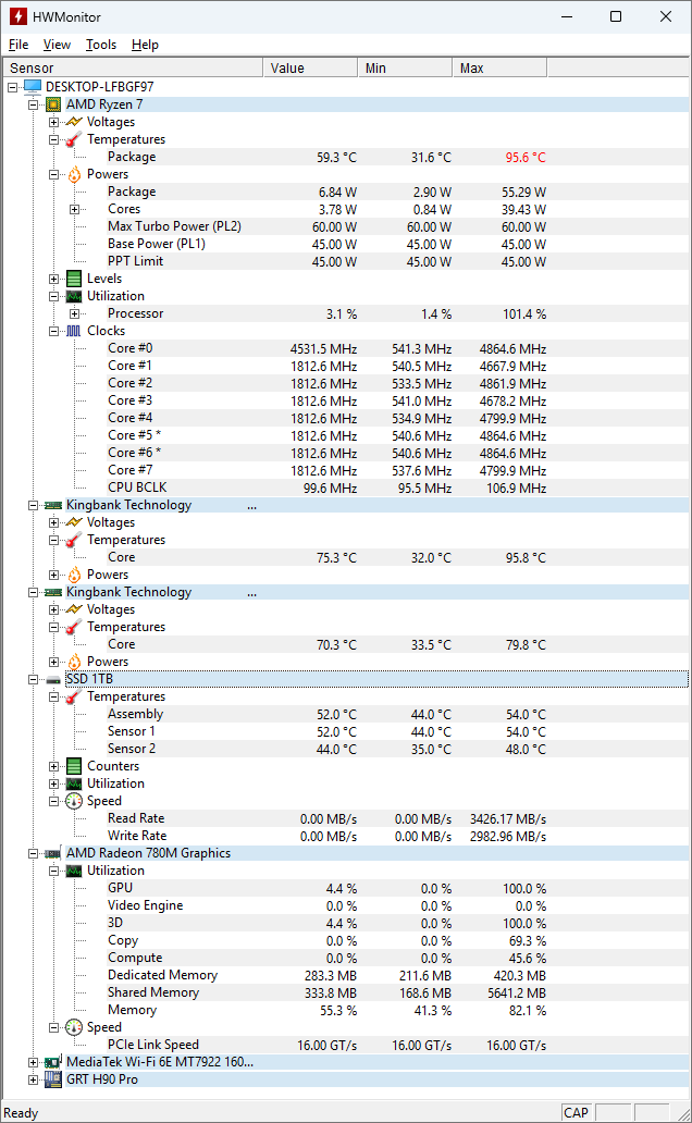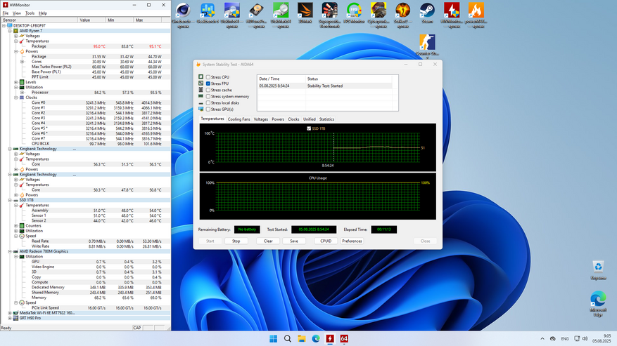 Данному мини-ПК жарковато. Причём добирается он до своей температуры в 95° практически в первые секунды начала теста, затем сразу начинает себя пытаться остудить уменьшая потребление, соответственно скидывая частоту. Максимум какой я видел в стрессе это 45 Вт, что для процессора 8745HS, является не максимальным значением теплопакета, но походу нагрева он скидывает потребление до 40 и менее Вт. В комбинированной нагрузки, когда начинает работать оперативная память, она доходит, а точнее одна из планок до 80°, где пытается удерживаться, а значение потребления просаживается еще ниже до 35-40 Вт. Первый скрин я получил после полного тестирования компьютера, но до стрессов, видно, что он доходил до своего предела, но за счёт импульсных скачков выходил на потребления в 55 Вт.