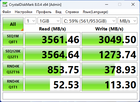В качестве накопителя, здесь используется PCIe 3 твердотельник, который показывает типичные результаты бюджетного устройства, а сколько я видел миников, других я и не встречал, в основном это всегда бюджетные накопители. Впрочем, он покроет 90% нужд пользователей.