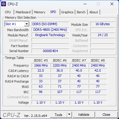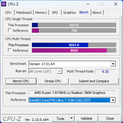 В основе компьютера лежит процессор AMD Ryzen 7 8745HS, по сути, он ничем принципиально не отличается от 7840HS. В случае 8845HS он тоже точно такой же, но у него есть нейроблок. В его основе 8 ядер ZEN4, все они без исключения умеют обрабатывать по два потока. Частота: 3.8-4.9 ГГЦ, теплопакет настраиваемый 35-54 Вт. В пару к нему установлена память, естественно DDR5 объёмом 32 ГБ, в виде двух планок по 16 Гб с частотой 4800 МГц. Можно ли поменять частоту в BIOS, и что будет если установить планку на 5600, попробую выяснить позже.