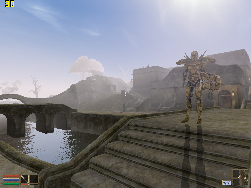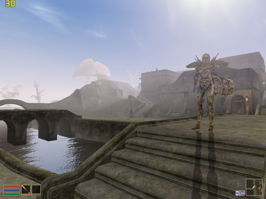- The Elder Scrolls III: Morrowind. Довольно требовательная игра из того времени. Она хоть и работала кое-как на моем Duron 1300 на низких настройках в 640x480, но и на Athlon XP и 9600 XT работает не то чтобы идеально. Нет, разумеется, это более чем играбельно, но я ожидал большего. При максимальной видимости и тенях выдает в среднем 30 FPS в Сейда Нин. Если выйти из поселения, то результат, естественно, заметно выше. А если немного убавить настройки где-то до середины, то можно получить уже что-то около 40, что намного комфортнее. Можно ещё включить 2xAA в драйверах, и тогда картинка станет намного приятнее. В то время я бы однозначно выбрал графон, как и любой нормальный школьник.