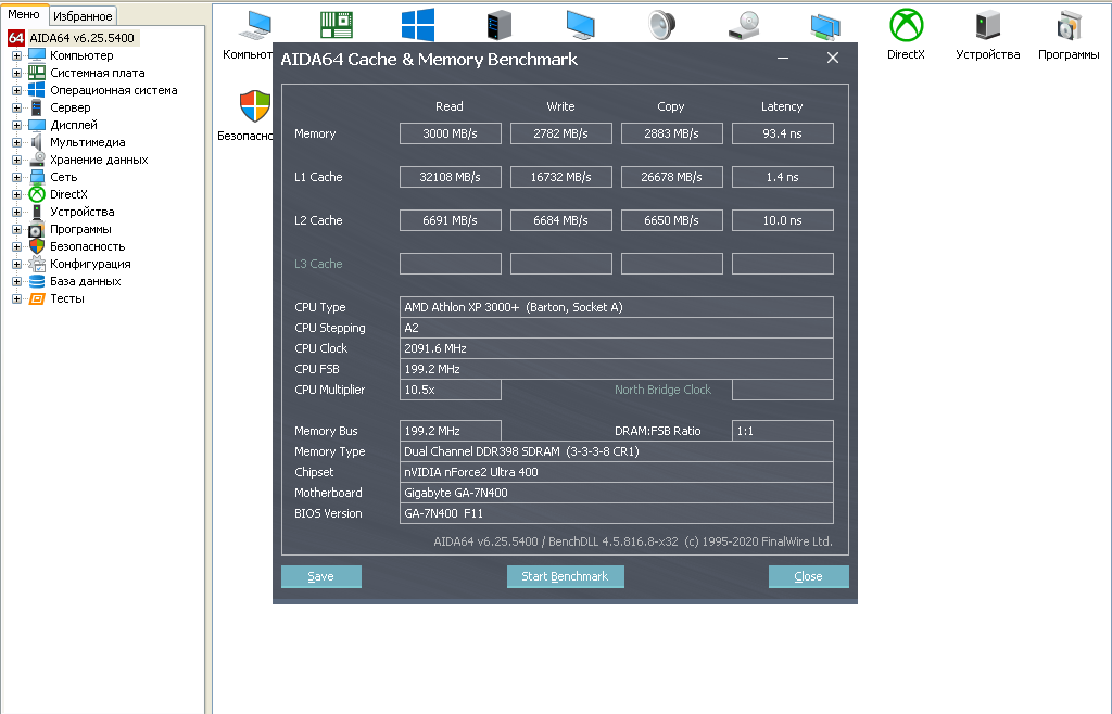 Процессор Athlon XP 3000+ 400 MHz FSB с множителем 10.5 и частотой 2.1 Ghz. Круче был только 3200+ с множителем 11. То есть, это практически топовый Barton с производительностью из коробки. Материнская плата GA-7N400 ничем особо не примечательна, но главное — она работает. С нюансами, но работает. Например, с установкой 4 модулей оперативной памяти она не хочет стабильно работать на 400 MHz. Так что буду довольствоваться 768 mb ОЗУ. Как раз в то время, это было вполне нормальным решением. То есть 3 модуля по 256 mb. Тем не менее, двухканальный режим работает. В 2003-2004 годах 512 mb было неким усредненным объемом оперативной памяти для домашнего компьютера. Было ли его достаточно? Да, но дополнительные 256 mb или 512 mb не стали бы лишними. Много у кого тогда было 256 mb или даже меньше.