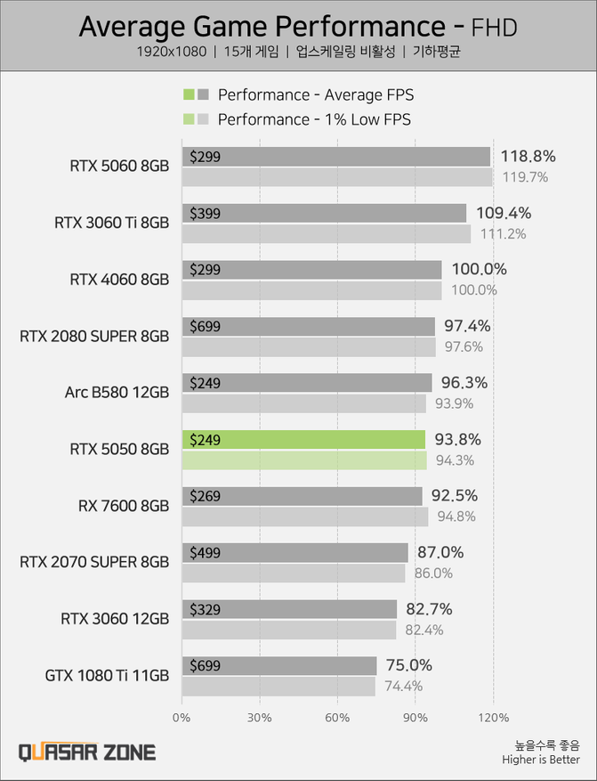 GeForce RTX 5050 оснащена 2 560 ядрами CUDA с тактовой частотой до 2 572 МГц, а также 8 ГБ видеопамяти GDDR6 с шиной памяти 320 ГБ/с. Для сравнения, RTX 5060 оснащена 3840 ядрами CUDA, 8 ГБ более быстрой видеопамяти GDDR7 и более широкой шиной памяти 448 ГБ/с, что означает, что она предлагает на 50% больше шейдеров и на 40% больше пропускной способности памяти, при этом стоит примерно на 20% дороже при стартовой цене в 299 долларов. Превосходное аппаратное обеспечение также приводит к лучшей производительности в реальных условиях: тестирование Quasar Zone показывает, что RTX 5060 примерно на 30% быстрее, чем RTX 5050, что делает модель более высокого уровня гораздо более выгодной.