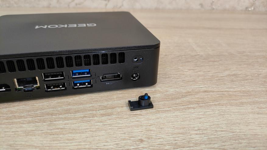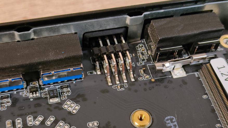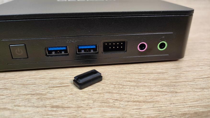 Спереди набор разъёмов следующий: 2*USB 3.2 Gen2, кнопка питания, миниджеки 3,5 мм для микрофона и наушников. Привлекает к себе внимание непонятная силиконовая заглушка, если её вытащить, там окажется колодка контактов как для USB 2.0 или подключения кнопок с индикацией на материнских платах. Фактически это так и есть, пришло с NUC'ов, была какая-то идея помещения чего-то маленького в большое и подобная колодка нужна была для дистанционного включения-выключения, то есть подключения других кнопок. Здесь, либо заготовка чего-то подобного, либо это самая ненужное вещь в данном мини-компьютере, так как кнопка питания у него есть.