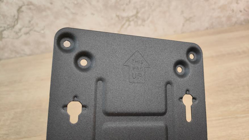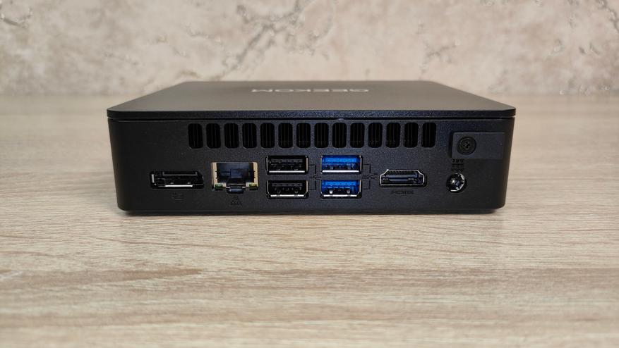 Сзади разъёмы следующие: питание 19 В, DP, гигабитная сеть, 2 порта USB A 3.2 gen2, 2 порта USB 2.0, HDMI 1.4 и какой-то крюк. Вероятно, он нужен как держатель кабеля, наверное. Загадка на загадке.