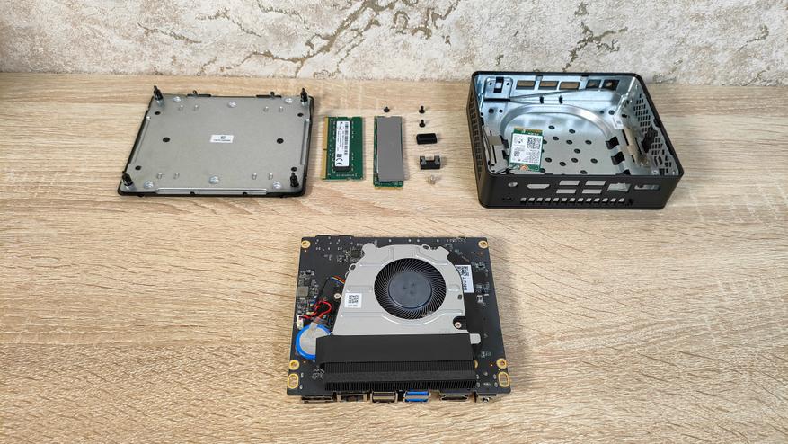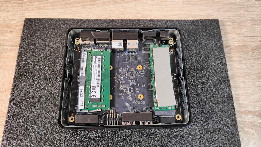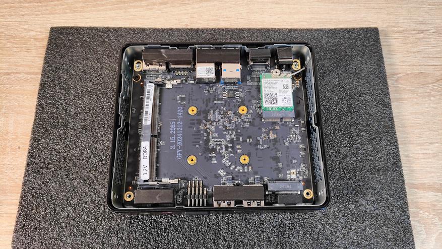 Разбирается мини-ПК легко и просто, выкручивается четыре винта, которые зафиксированы в крышке, то есть они не потеряются, снимается крышка, с этого момента получаем доступ к одной стороне материнской платы, где установлены оперативная память, накопитель, модуль беспроводной связи.