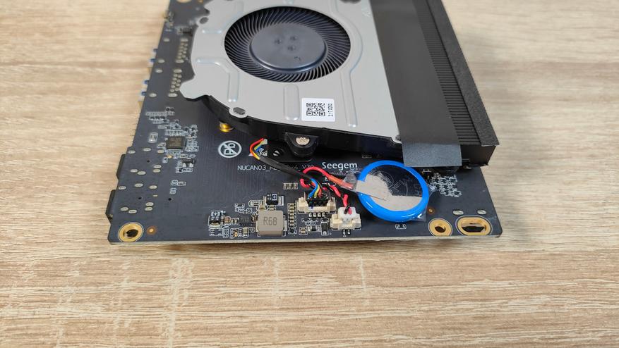 С другой стороны установлены радиатор с вентилятором, то есть система охлаждения, батарейка и собственно всё. Место достаточно чтобы можно было продуть данный компьютер без полной разборки, но делать это лучше с регулярностью раз в 3-4 месяца, чтобы пыль не успела скомковаться в одеяло, особенно если рядом есть постель или есть домашние животные.